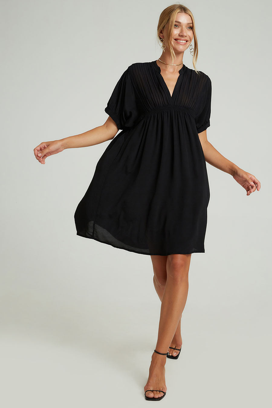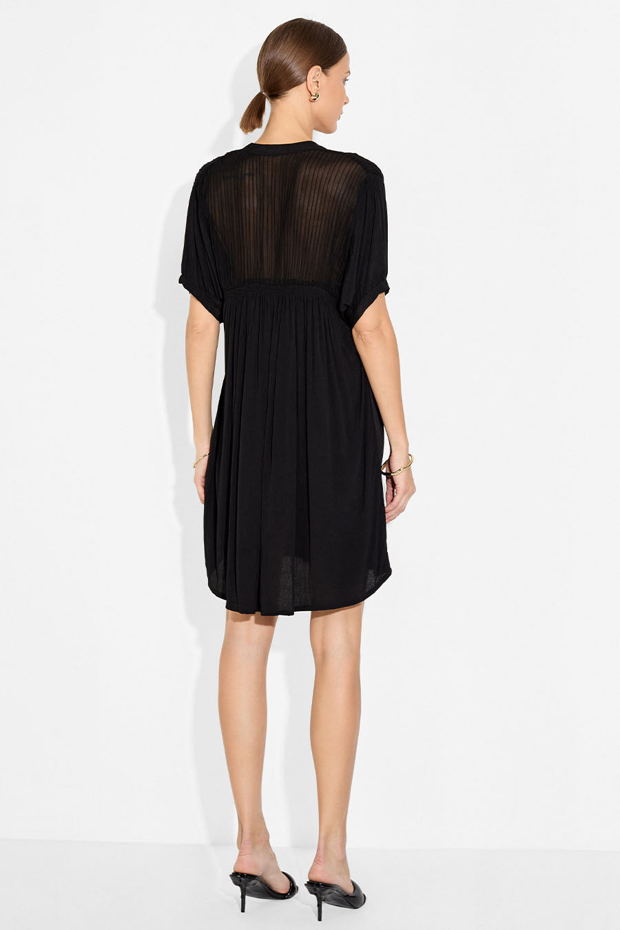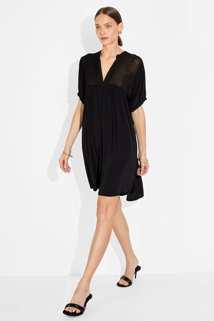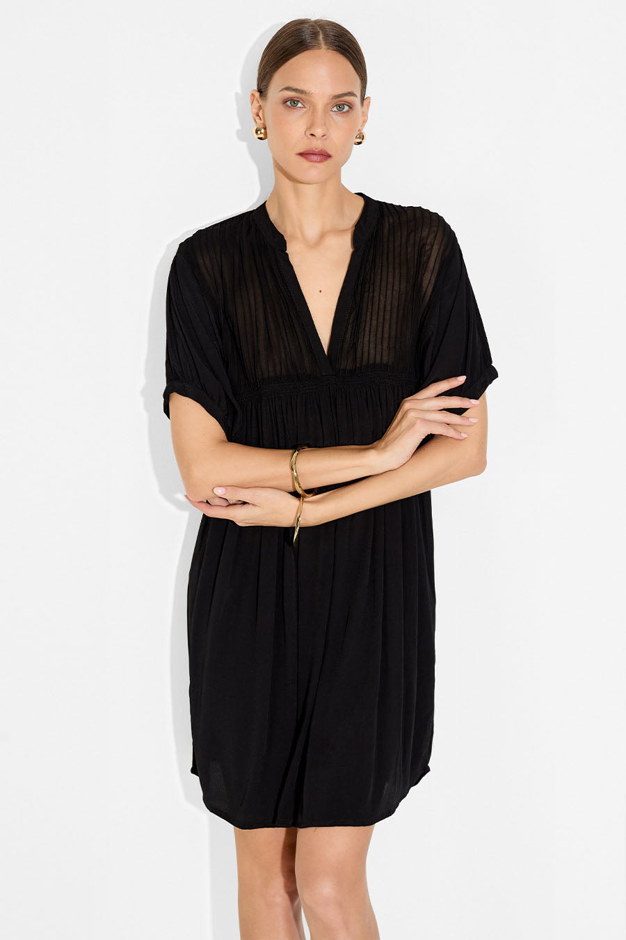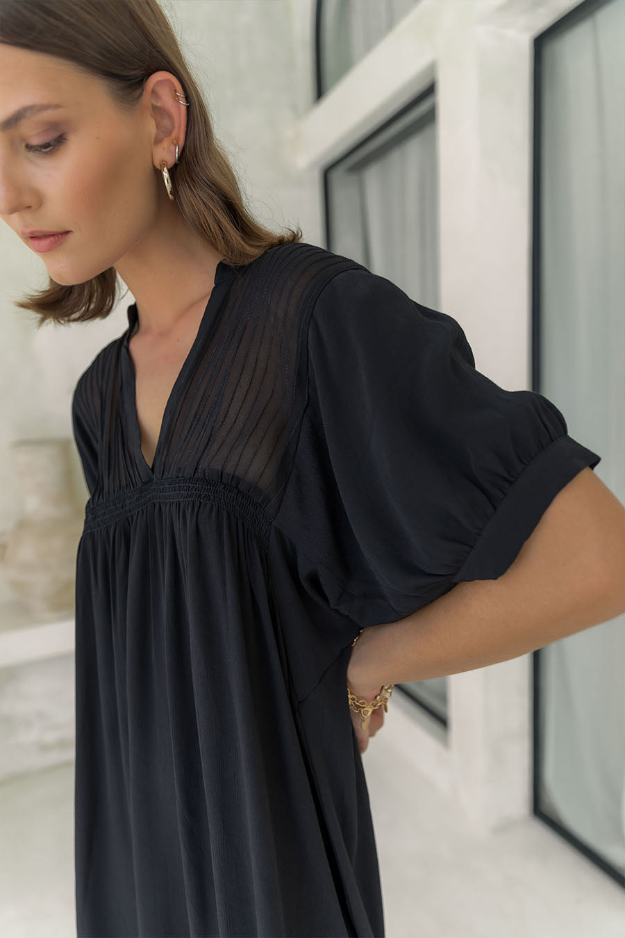 Elevate your wardrobe with the effortlessly chic Silvia Mini Dress. Crafted from soft, breathable viscose, this versatile black mini dress features a delicate sheer fabric overlay with intricate pin-tuck detailing on the upper body. Its relaxed, flowy fit offers both comfort and sophistication, making it perfect for any season.