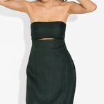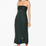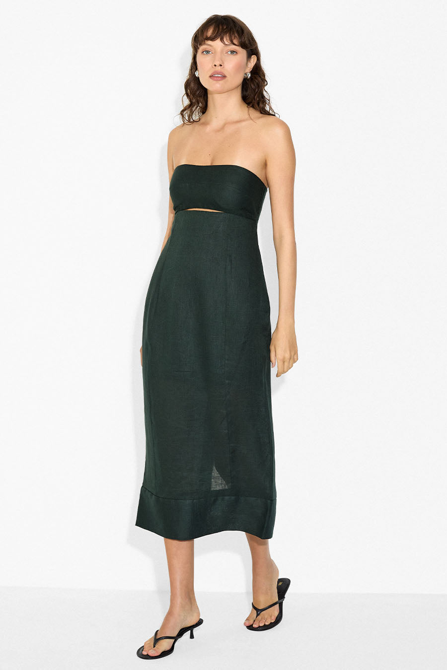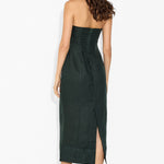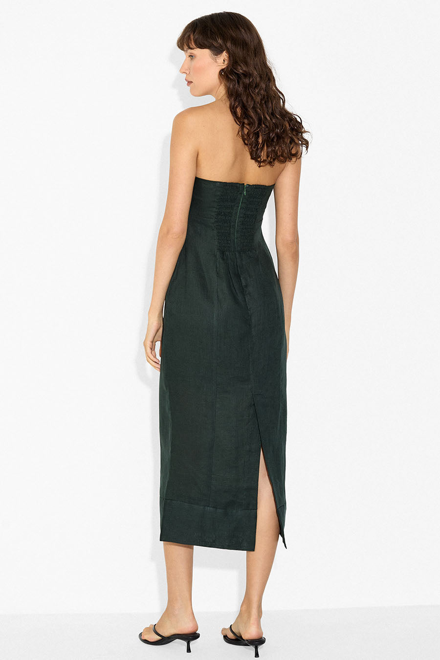 The Briana Midi Dress is a strapless piece crafted from breathable linen in a fitted silhouette. A front cut-out detail separates the bust from the skirt, showing a touch of skin that adds a hint of allure. Side boning and padded cups provide support and structure, while paneling on the skirt adds subtle uniqueness. The back features shirring and a zipper closure for a comfortable fit, finished with a center back slit for ease of movement. Elegant yet effortless, this piece transitions beautifully from daytime events to evening occasions.
