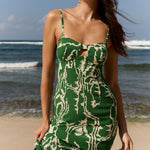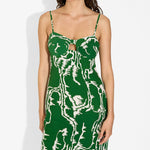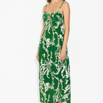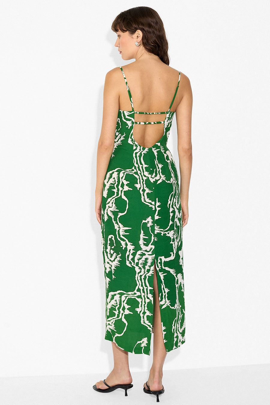 The Celia Midi Dress is a flattering silhouette crafted from Crepe textured Rayon fabric in our bold isla green print. It features a sculpted bust with a subtle front cut out, adjustable straps, zip closure at side seam and an open back accented with soft elastic strap details. The midi length skirt is finished with a back slit for ease of movement, making this dress both elegant and effortless
