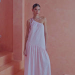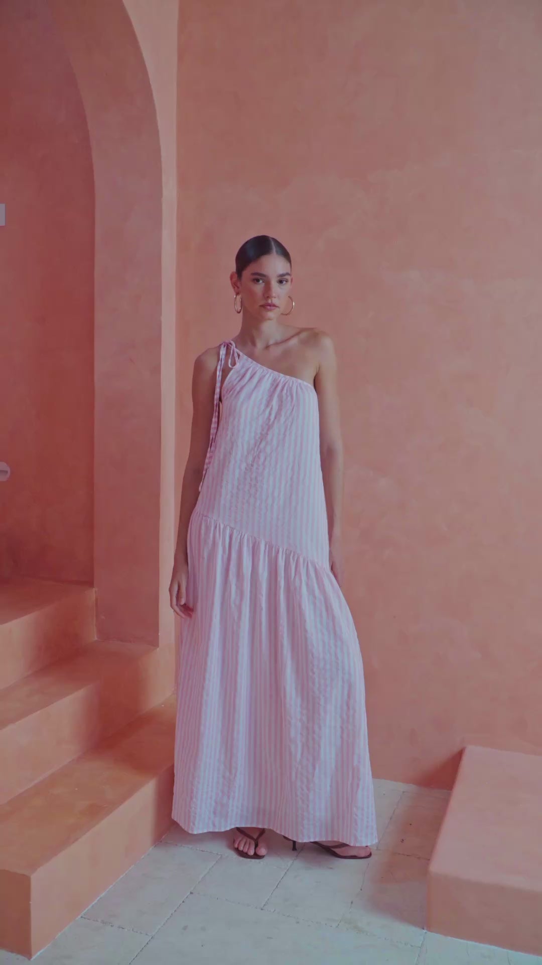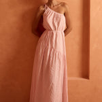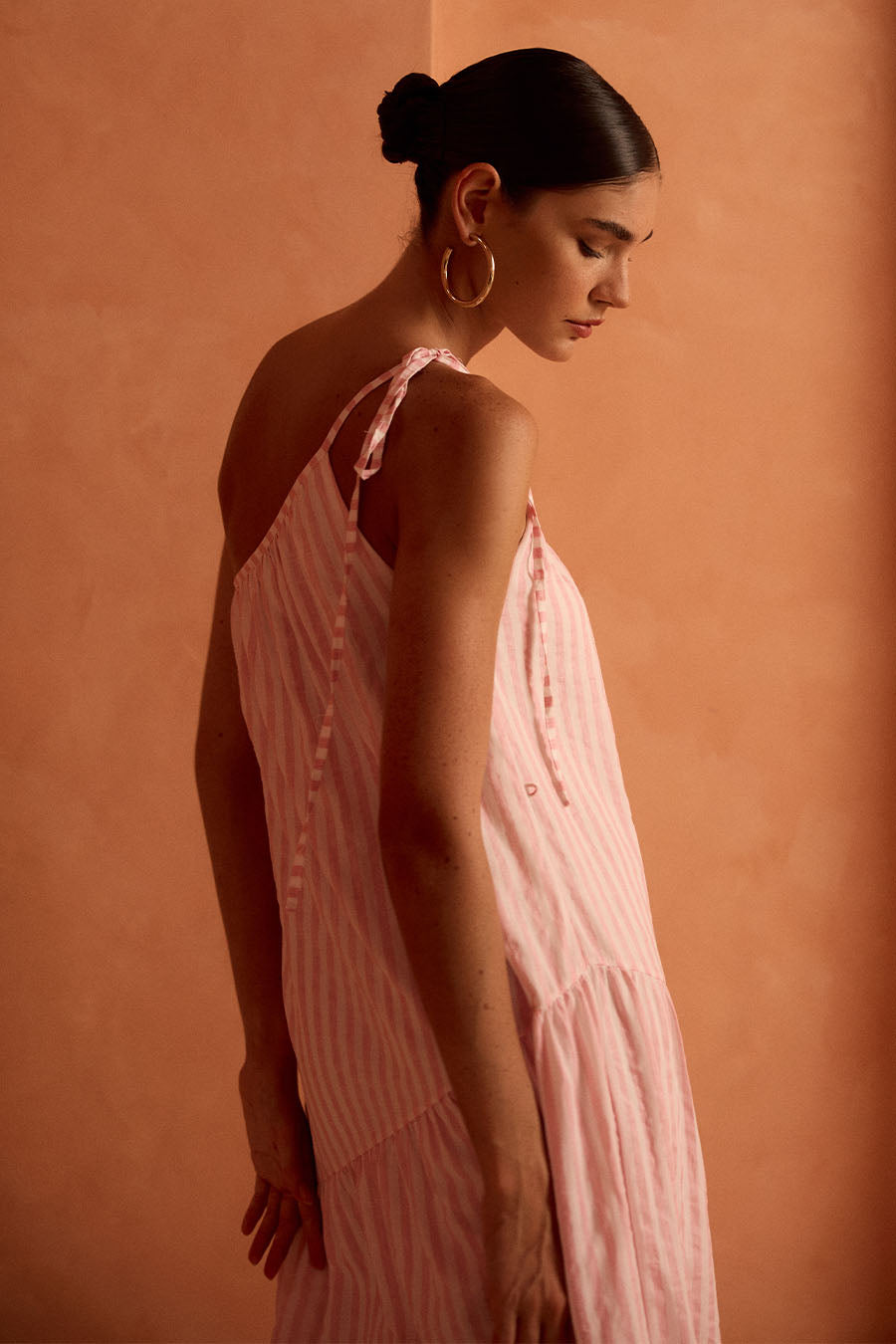 Lucy Maxi Dress with one-shoulder neckline, flowing cotton silhouette and blush stripes print. Fully lined, elegant and perfect for relaxed summer days.