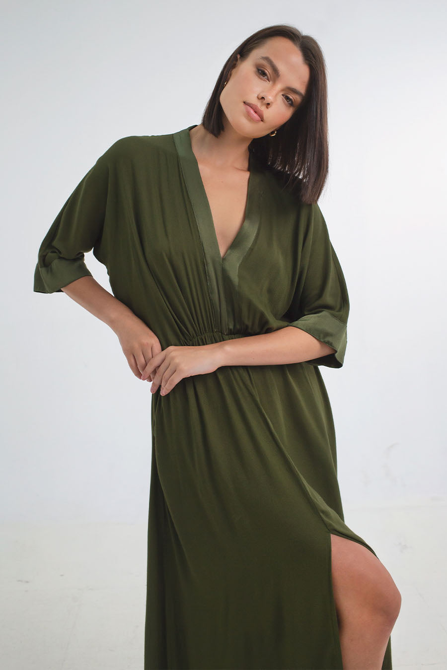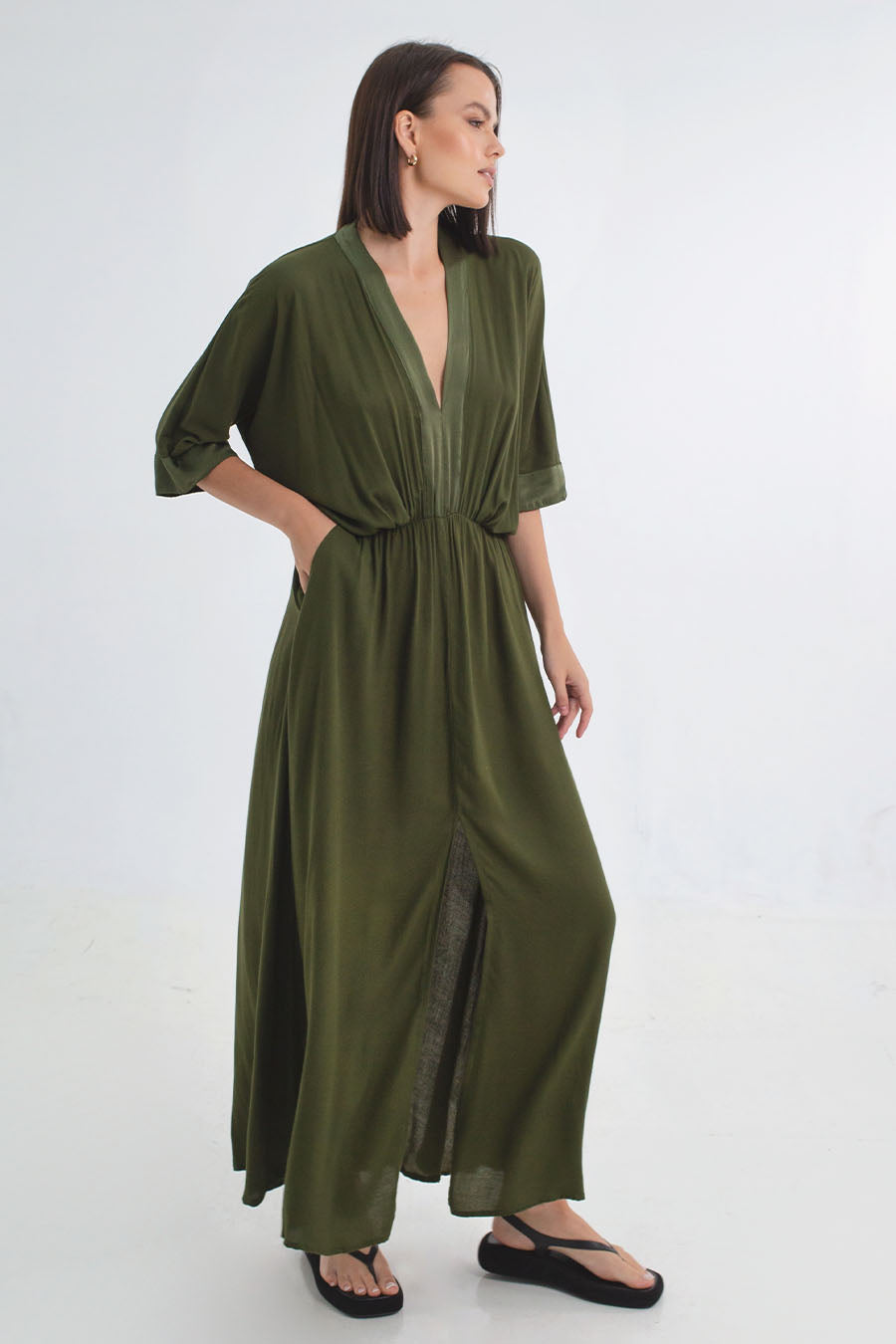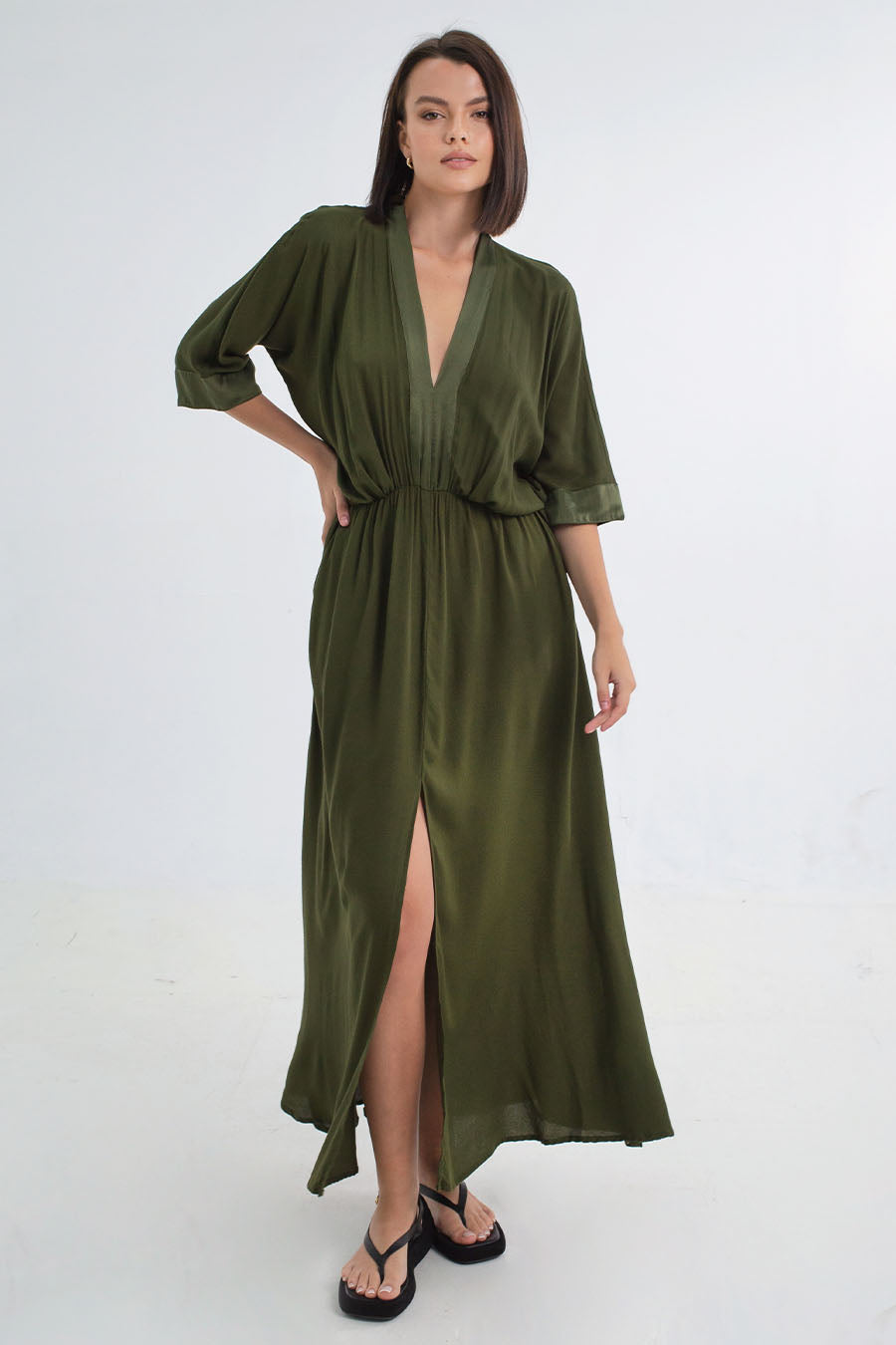 An elegant Maxi Kaftan, fabricated from rayon with V neckline in satin fabric and front slit details. It is the ultimate casual yet chic daytime outfit.
