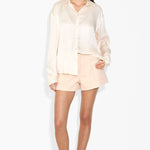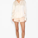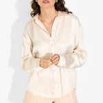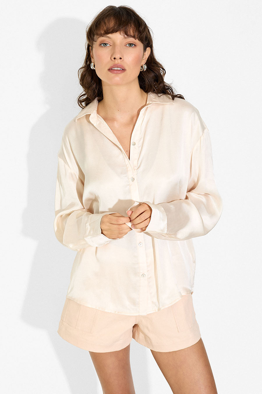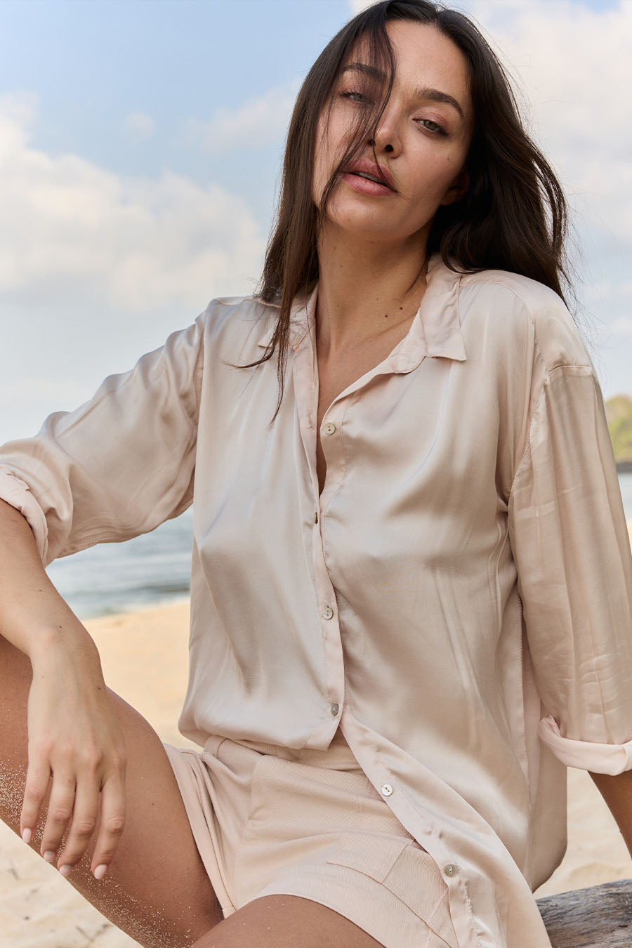 Effortlessly timeless, the Emma Shirt is a refined wardrobe essential crafted from fluid rayon viscose with a soft, silk like sheen. Designed with a relaxed, loose fit, it drapes beautifully on the body, offering both elegance and comfort. Classic details like a pointed collar, button down front, and delicate shell buttons give it a polished look that never goes out of style. Wear it tucked, tied, or open over a dress the Emma Shirt is endlessly versatile.