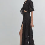 Crafted in cotton, the Alya Maxi Skirt features a unique leg split design adorned with exquisite Balinese cut-out hand embroidery throughout. Elevate your style effortlessly blending traditional artistry with modern fashion.