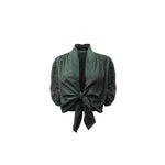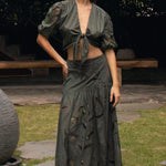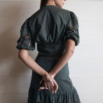Infuse your wardrobe with a splash of color and craftsmanship with the Ayla Top in striking Chrome Green. This piece features intricate cut-out embroidery that adds texture and a peek of skin for a subtly alluring look. The deep V-neck and front tie closure enhance its feminine appeal, while the elasticated sleeves can be adjusted for a puff or sleek style. Finished with a cropped fit, this top pairs beautifully with high-waisted bottoms for a casual look or our Ayla Maxi Skirt for a more elevated look.