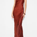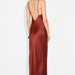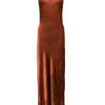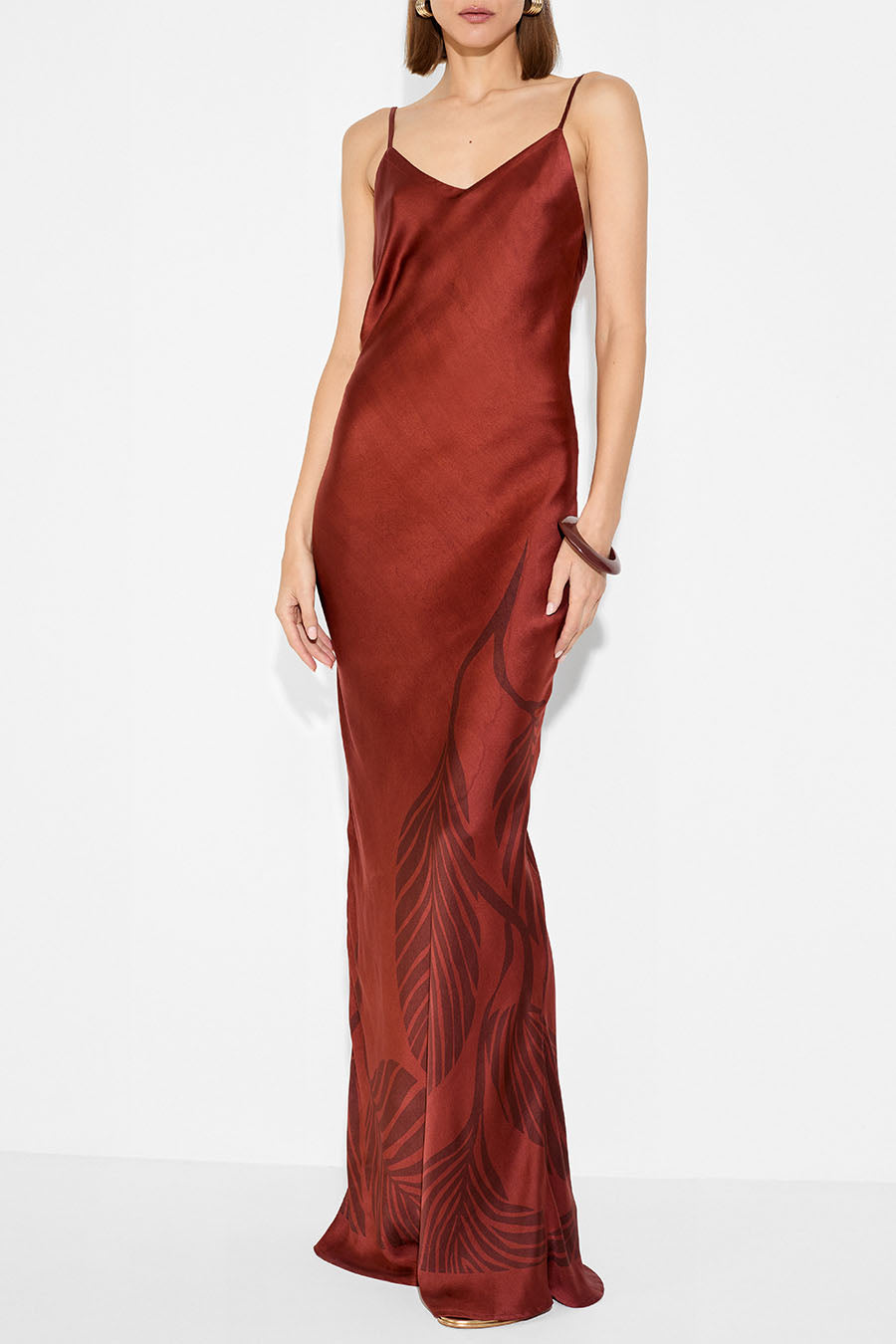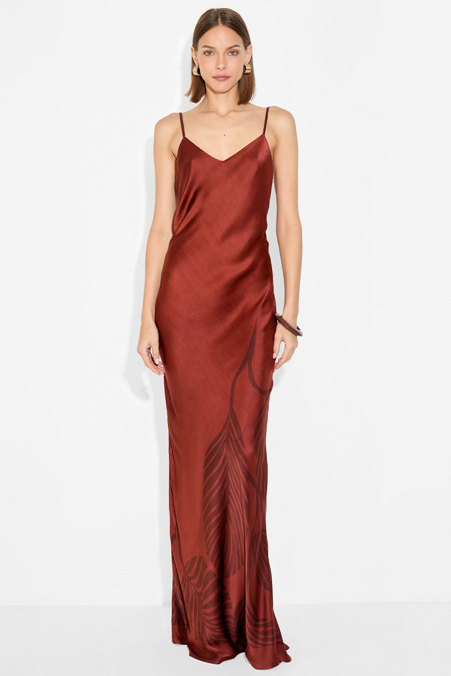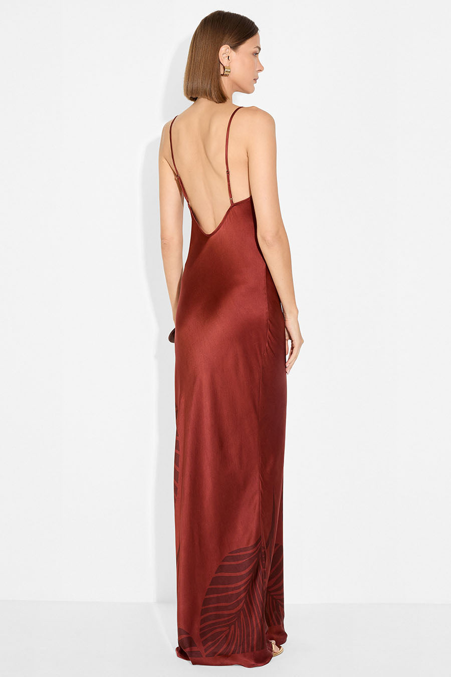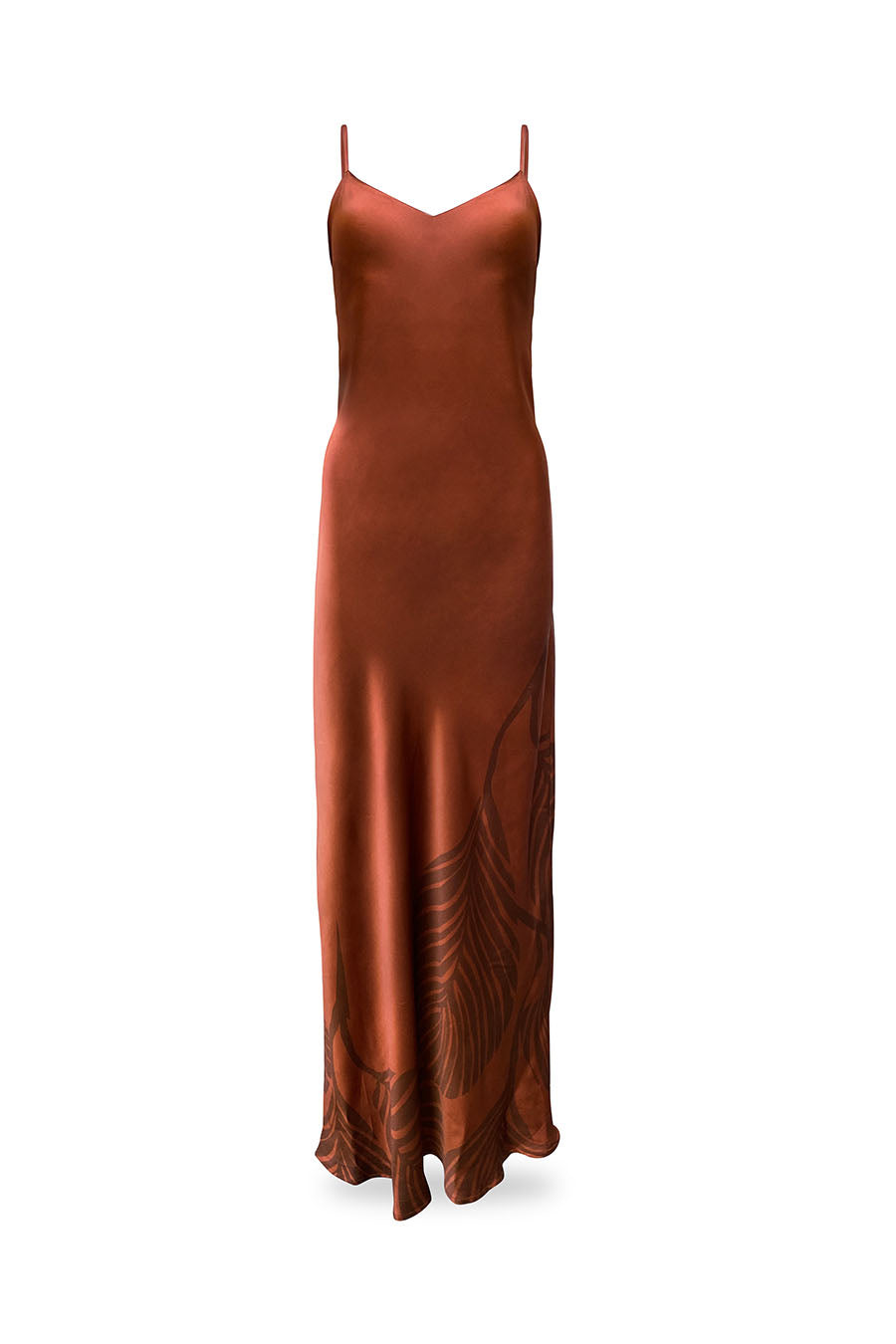 Elevate your evening attire with the Camisole Leaf Maxi Dress, crafted from lustrous Silk Satin in an eye-catching Henna hue. This elegant piece features a distinctive handmade palm tree print, blending classic elegance with modern flair. The flowing silhouette and sumptuous fabric ensure both comfort and style for any sophisticated event. Perfect for gala evenings or special dinners, the Camisole Leaf  Maxi Dress  is designed to make a statement with every graceful movement.