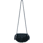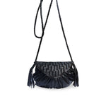 Petite leather crossbody bag with detachable shoulder strap. Show-casing braided ankles and hand cut tassels with circles handmade from cut leather sequins that are sewn into the flat of the bag.
