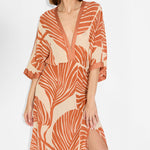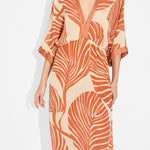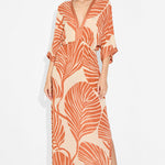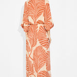 A stunning maxi kaftan made from slightly sheer viscose georgette, featuring an exclusive handmade print. Detailed with luxurious viscose satin for an extra touch of charm and elegance. Comes with a skin color slip dress to wear underneath for added comfort and coverage when needed.