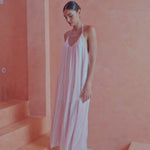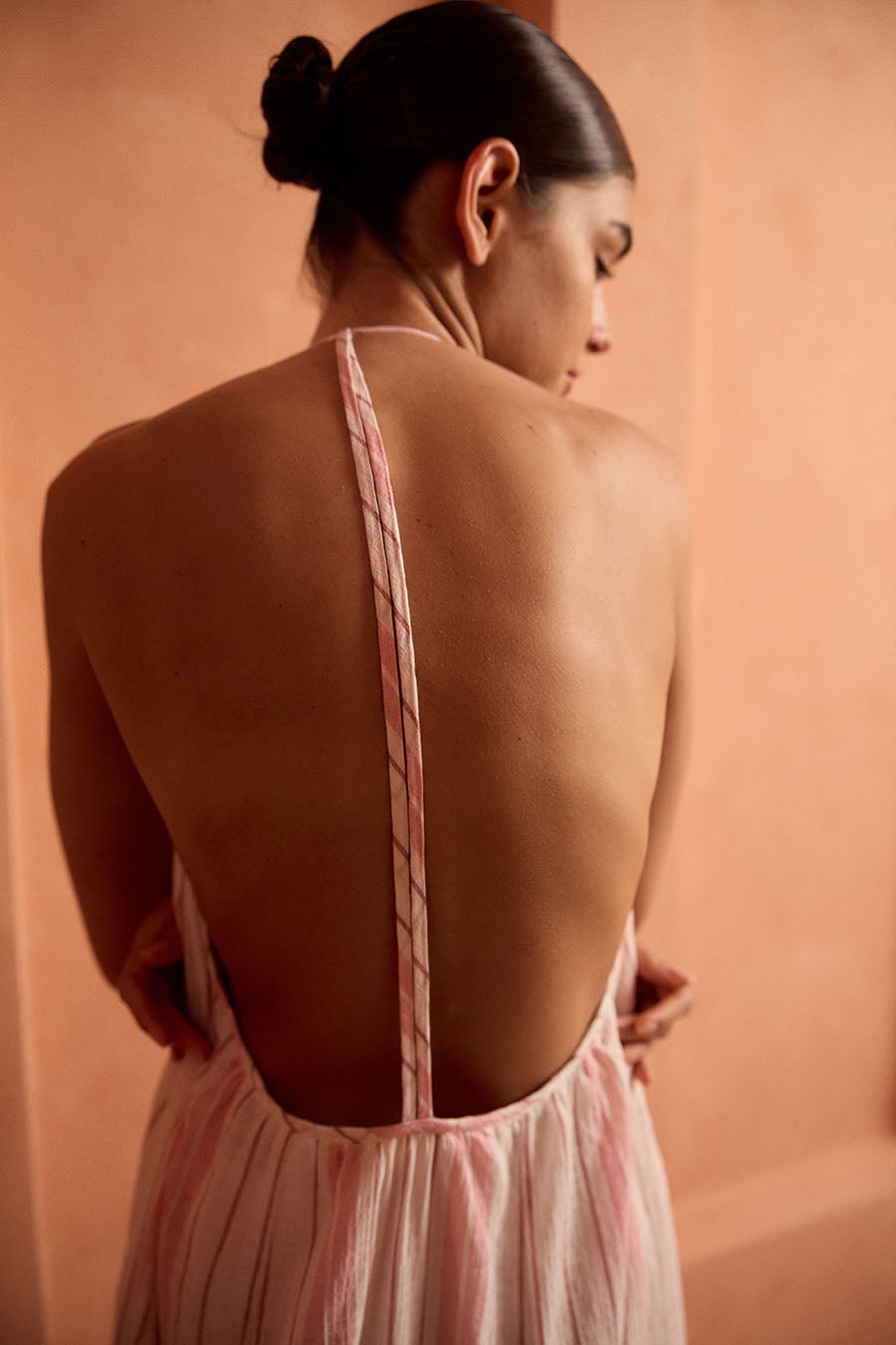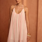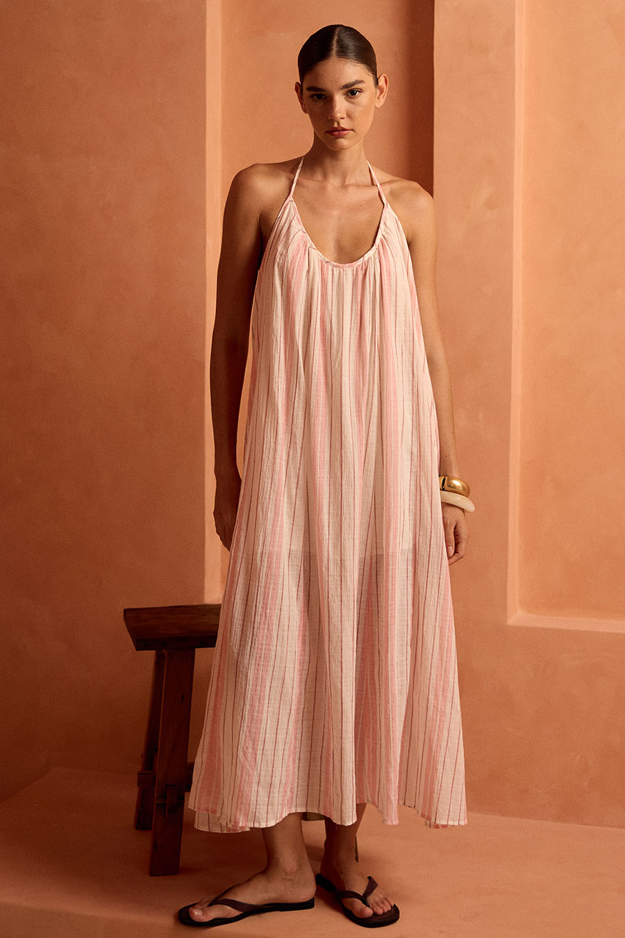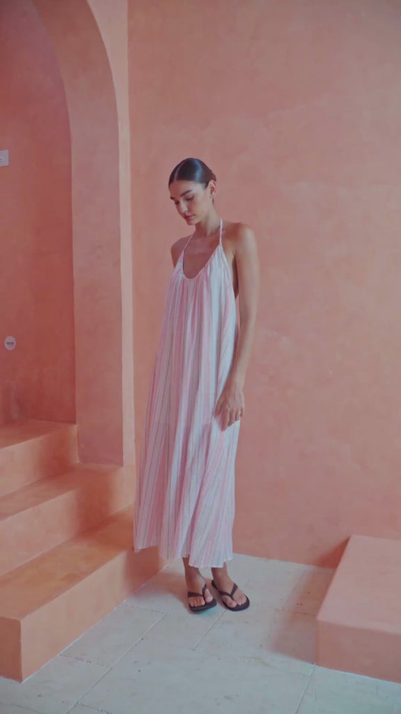 Leona Maxi Dress in blush stripe with deep V halter neckline, relaxed A-line silhouette and minimalist open back. Modern, effortless and elegantly elongating.