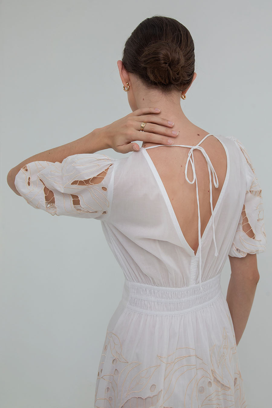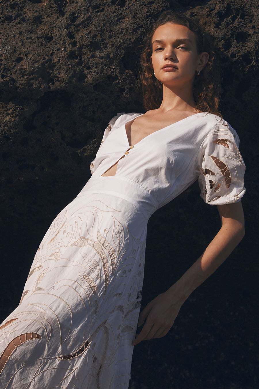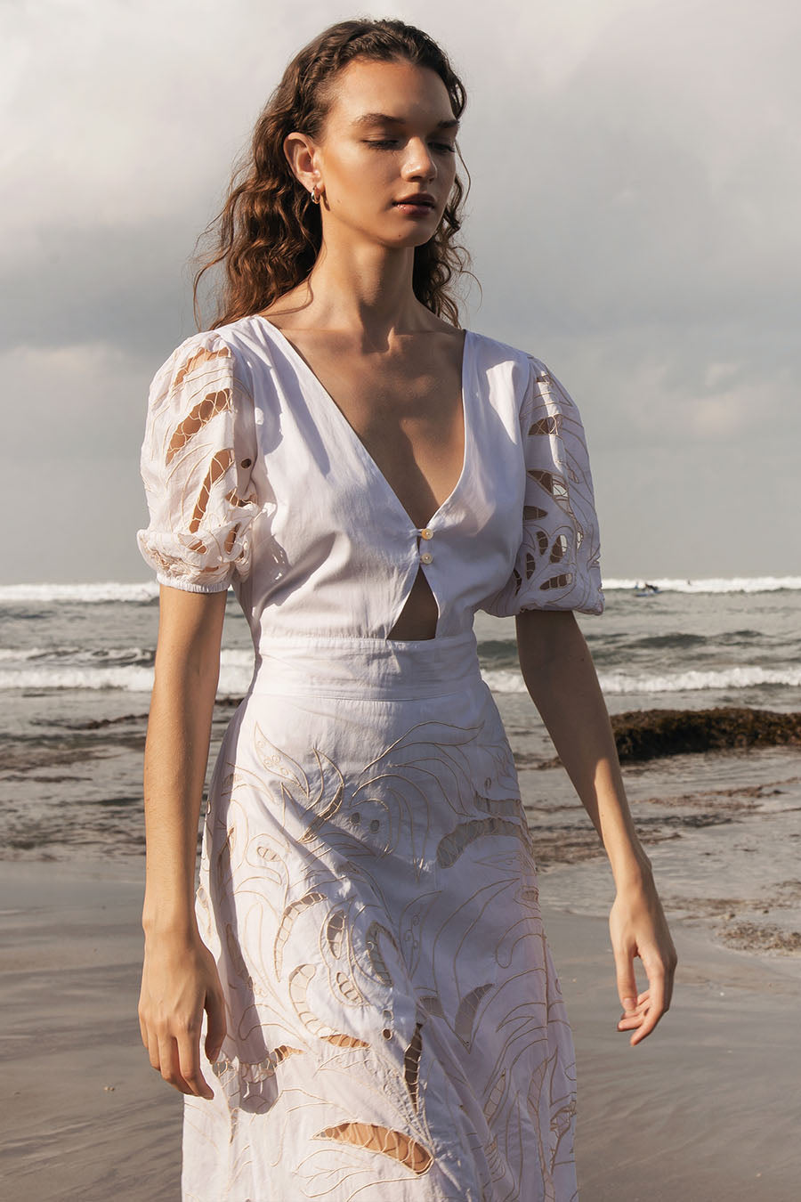 Discover elegance and comfort with our Alya Midi Dress. Crafted in cotton, this Dress features an exquisite Balinese cut-out hand embroidery throughout. It's the perfect style to elevate your wardrobe effortlessly.