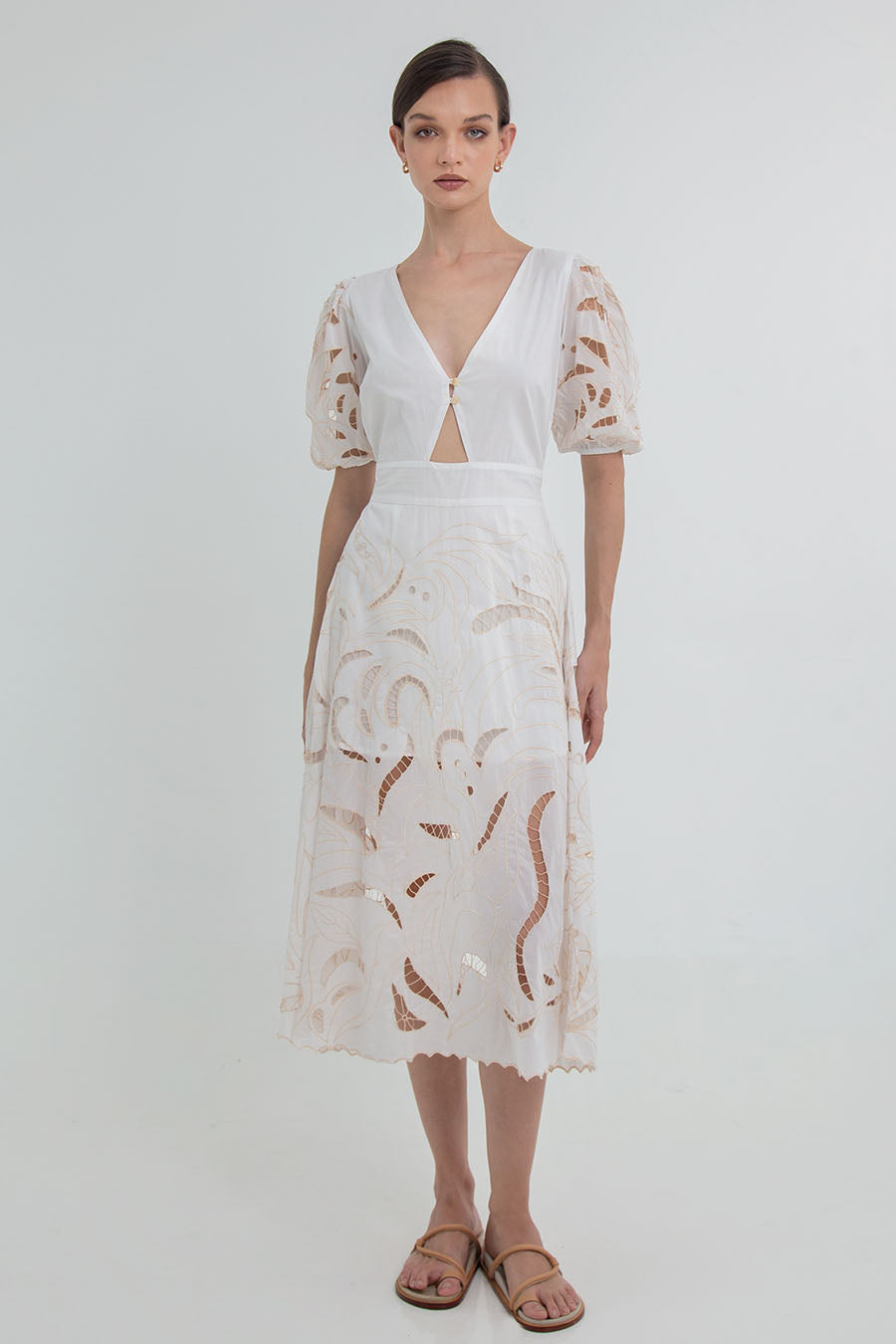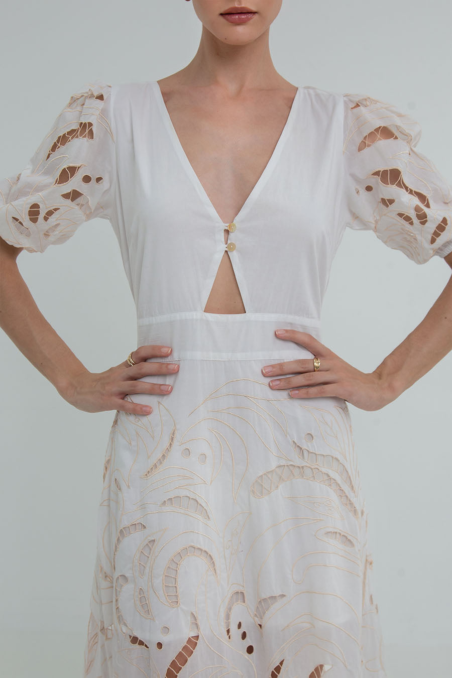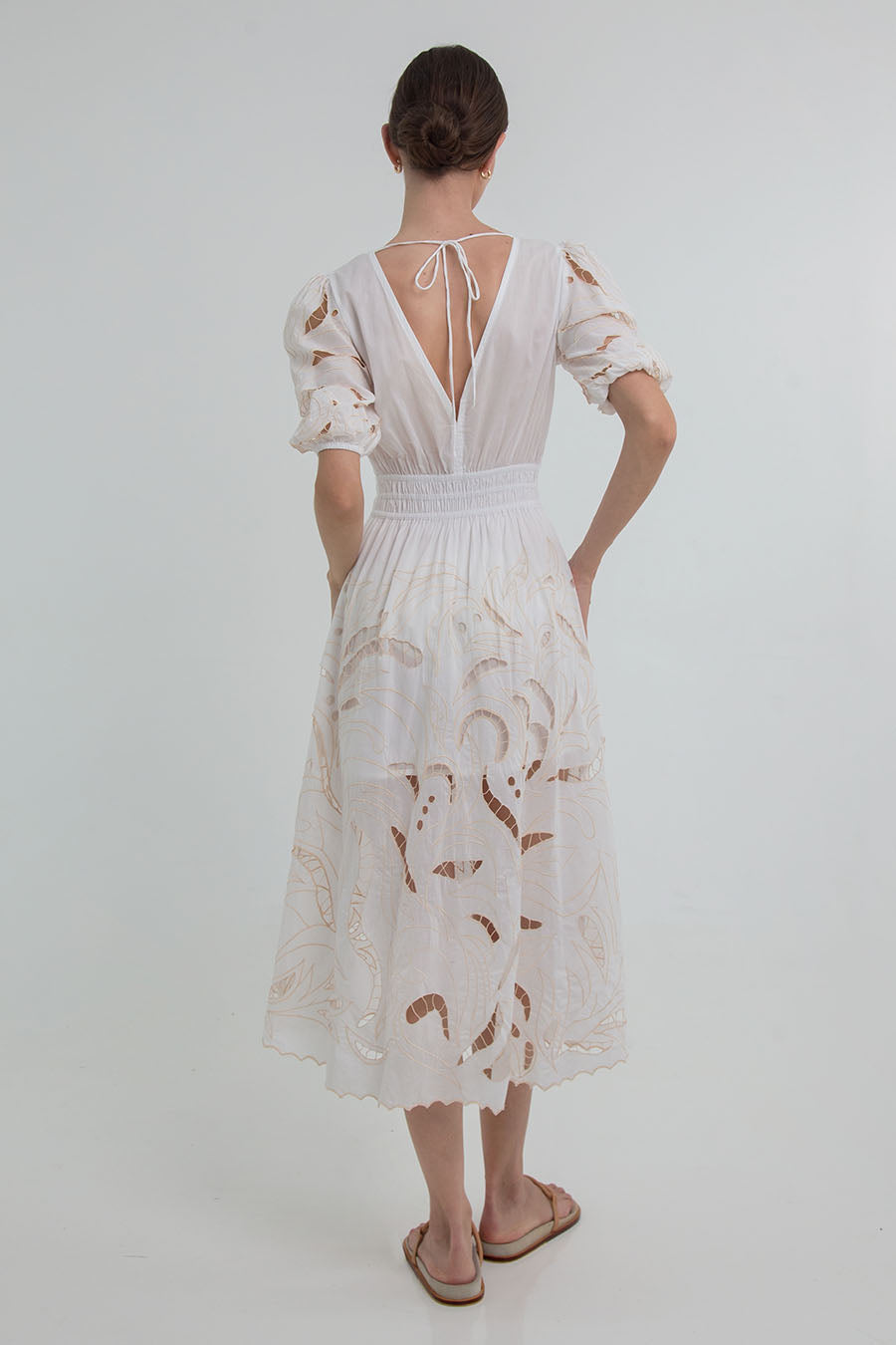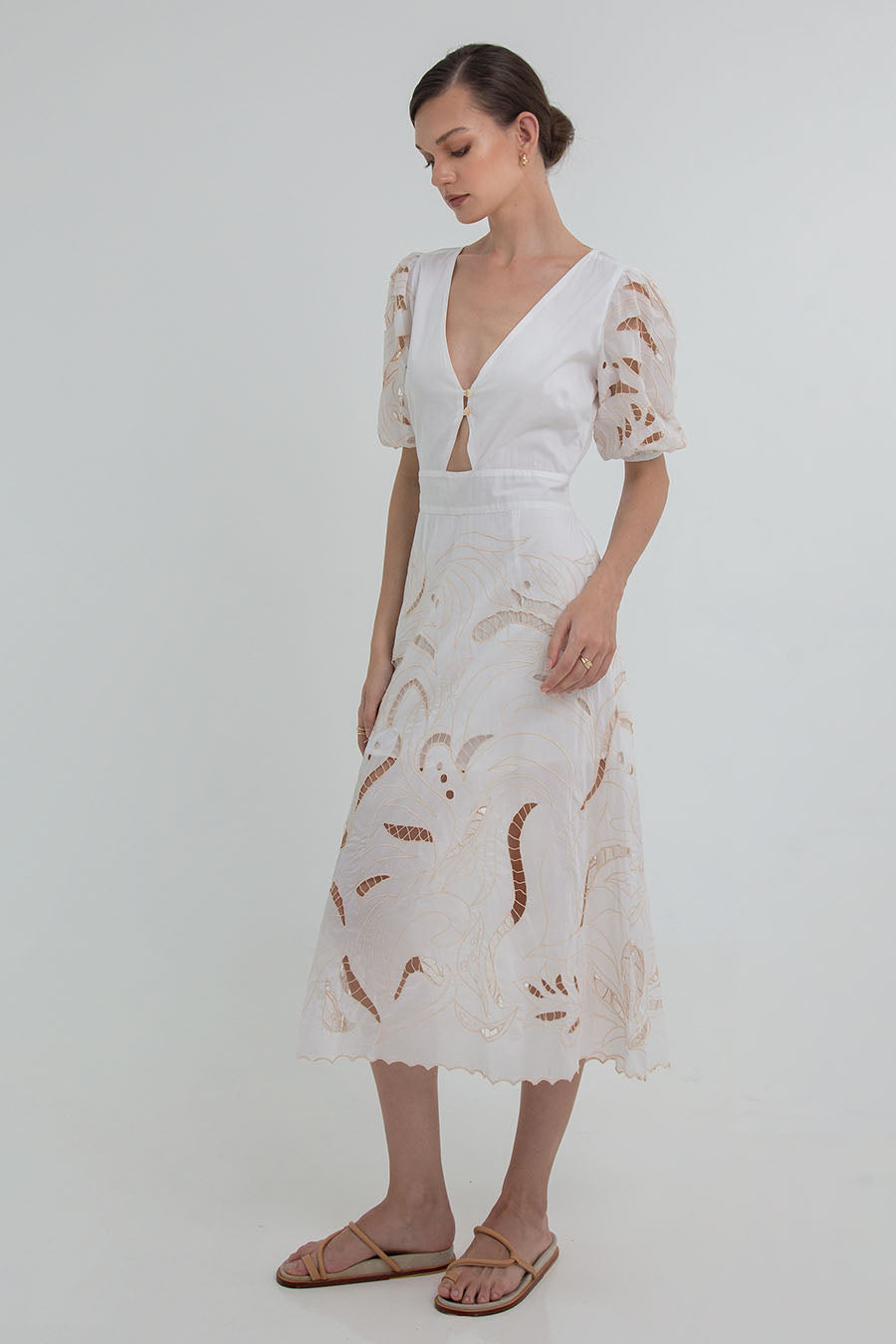 Discover elegance and comfort with our Alya Midi Dress. Crafted in cotton, this Dress features an exquisite Balinese cut-out hand embroidery throughout. It's the perfect style to elevate your wardrobe effortlessly.