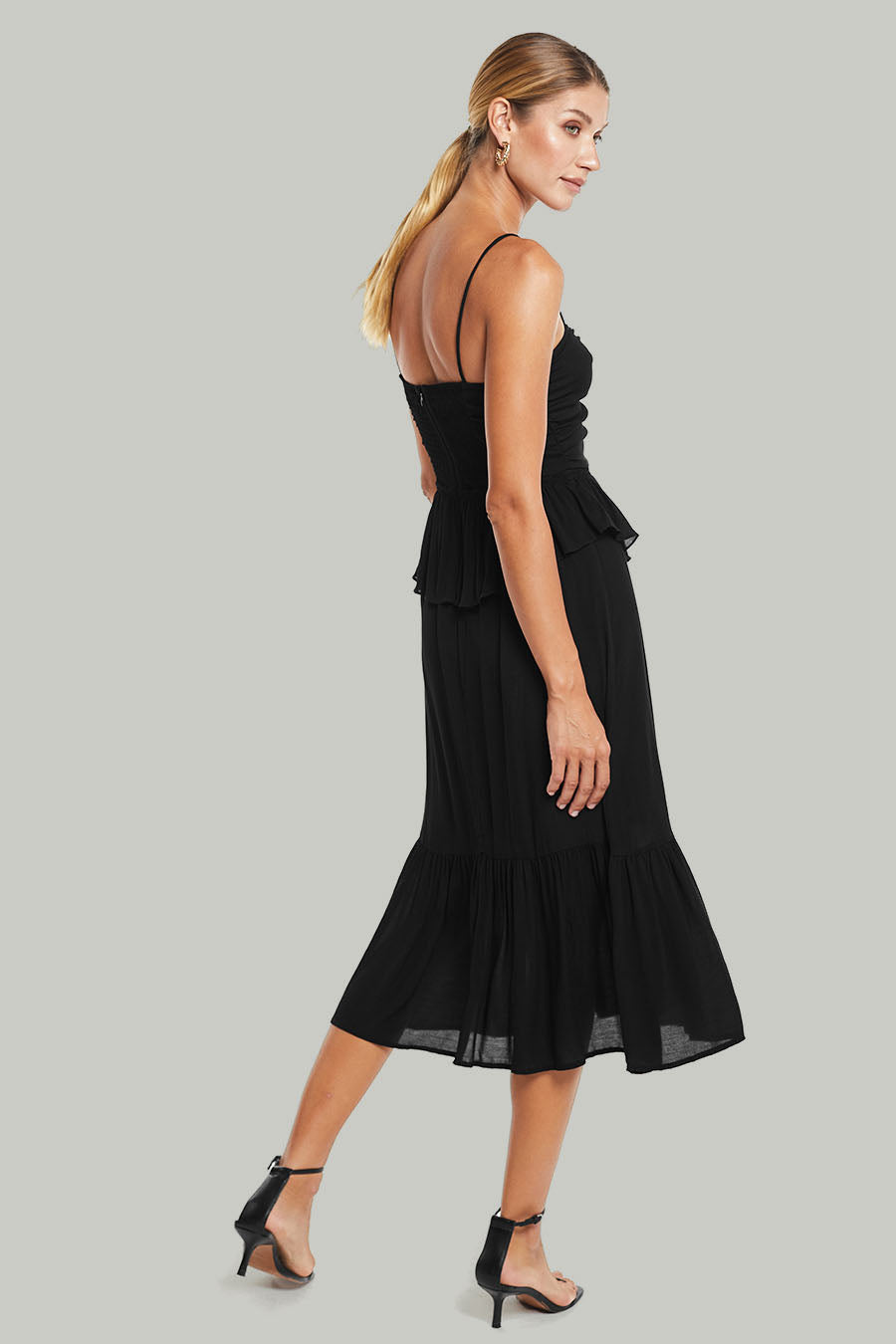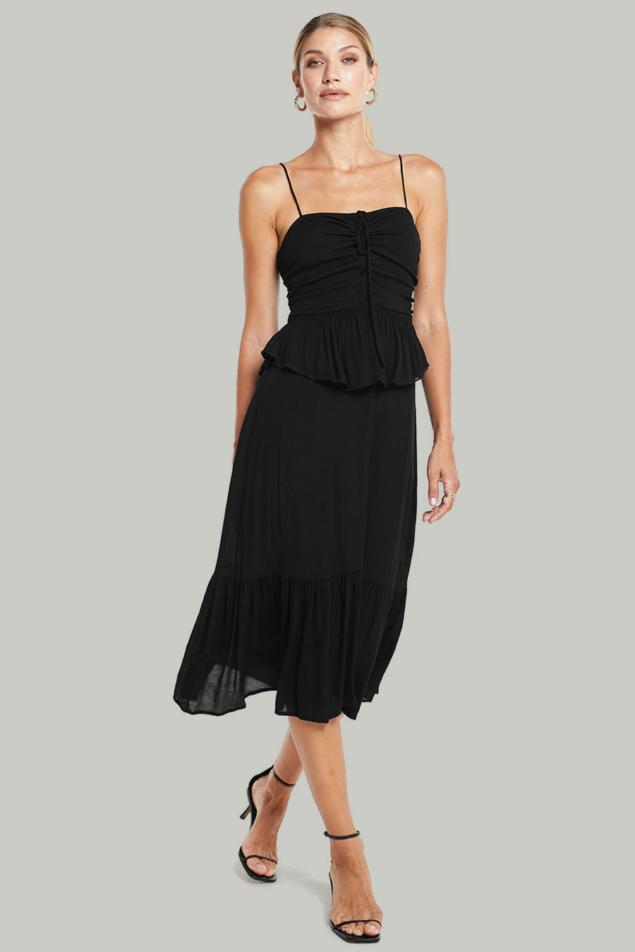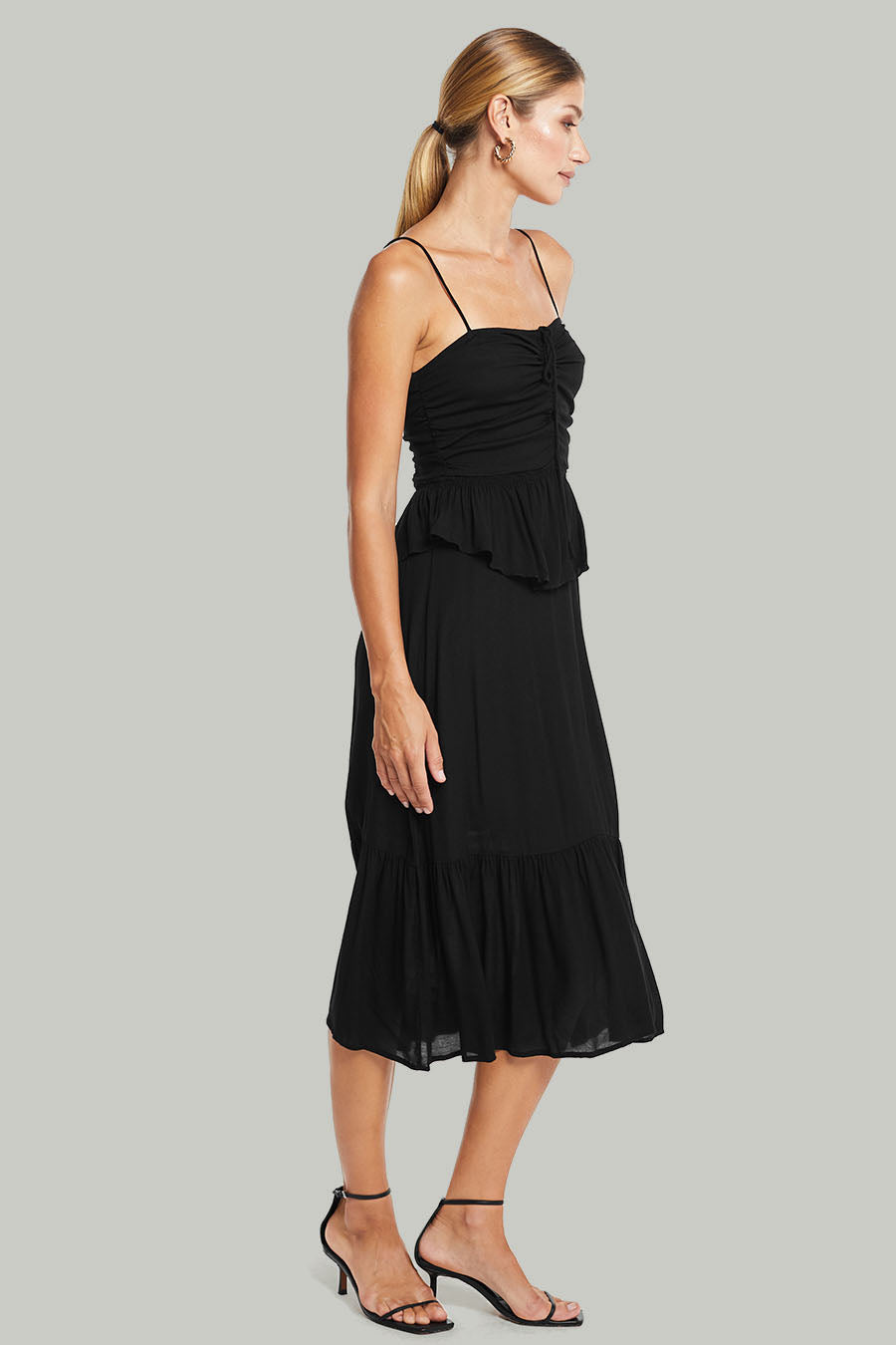 The Casia Midi Dress features a ruched bodice with ruffle detail and a slim midi fit skirt. Crafted in rayon and finished with a zipper down the back.