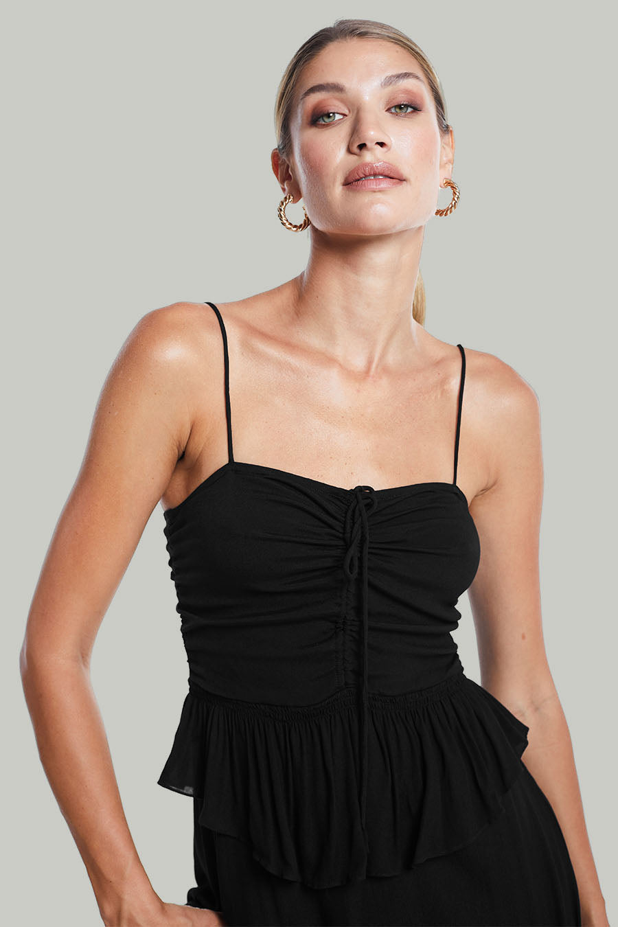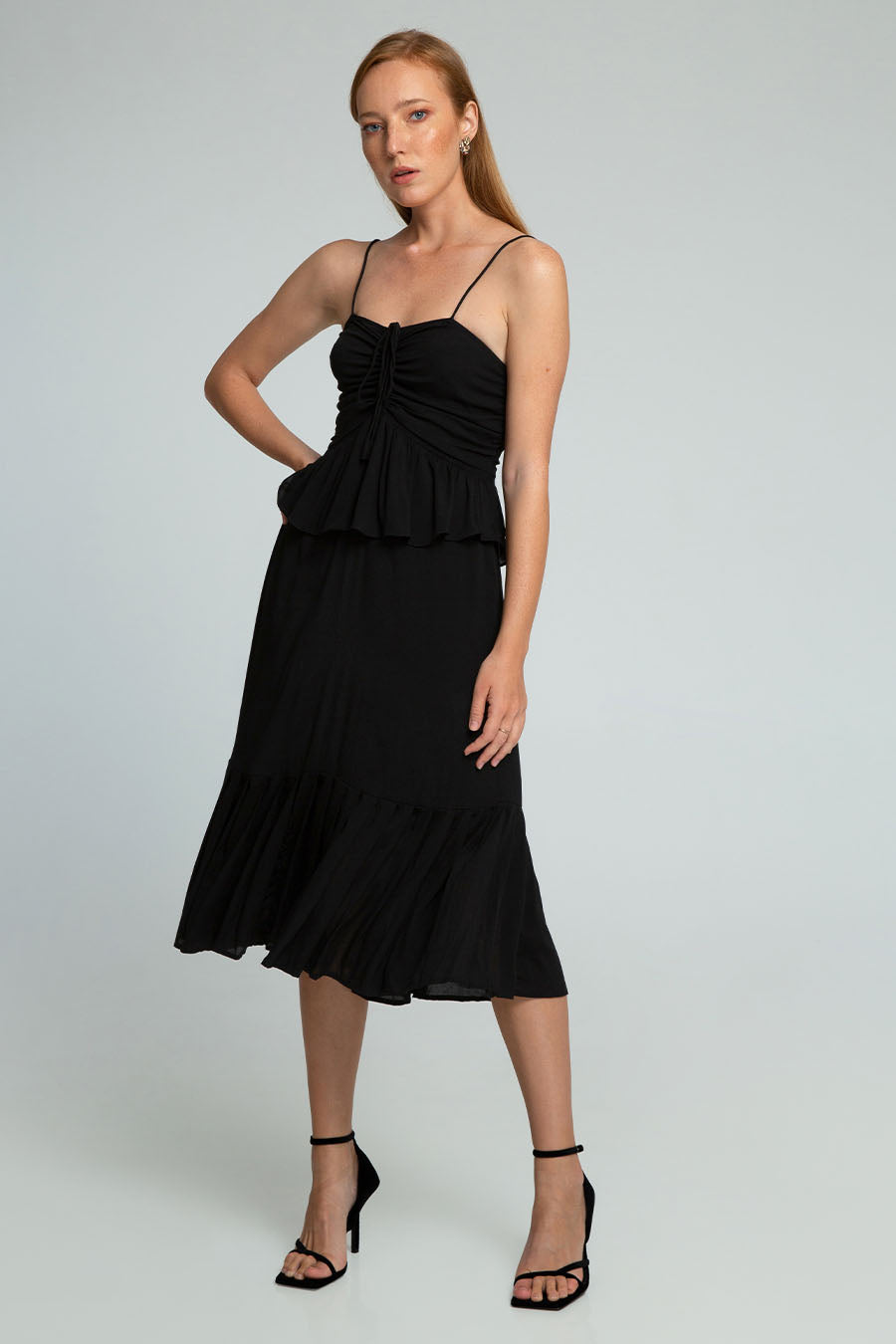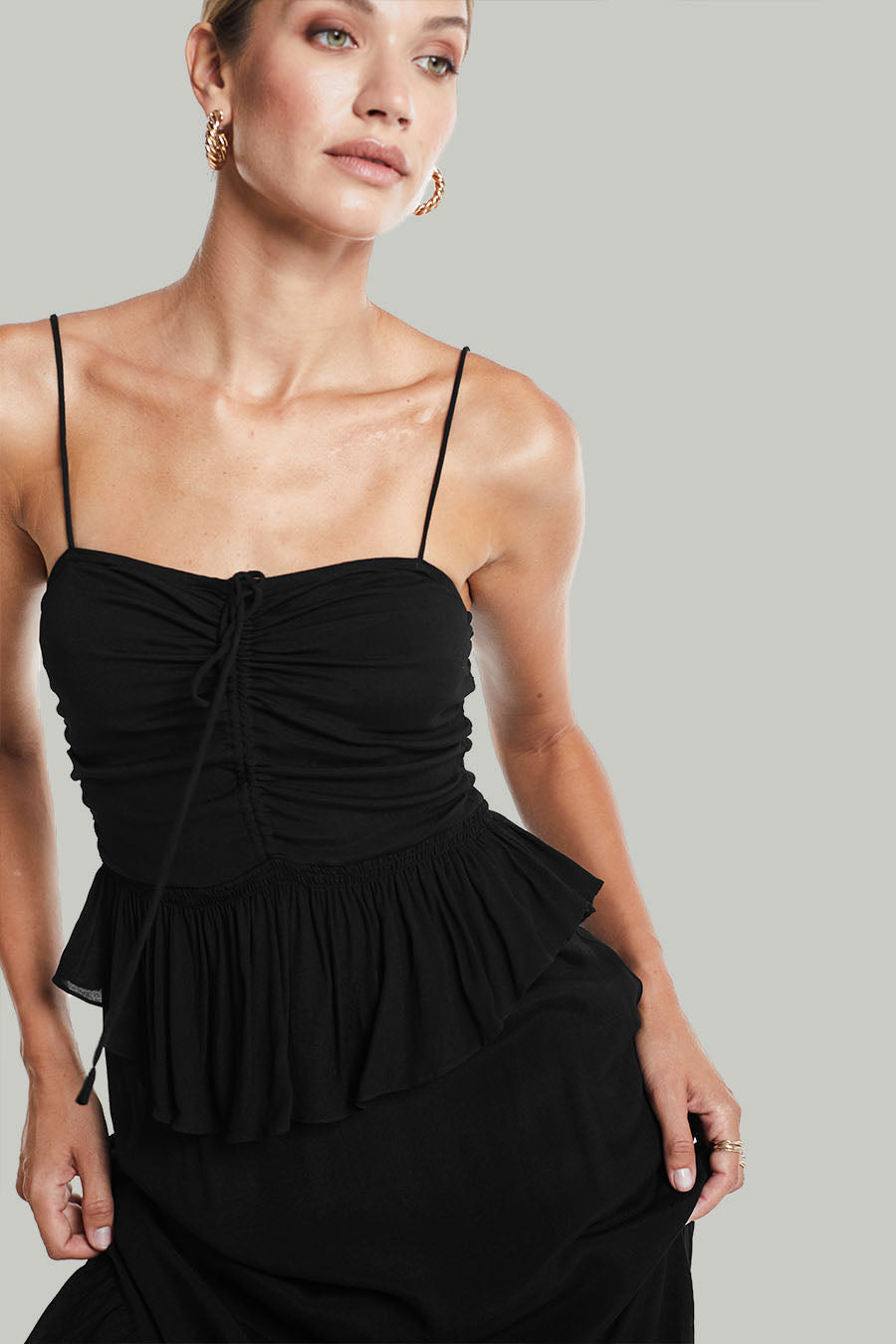 The Casia Midi Dress features a ruched bodice with ruffle detail and a slim midi fit skirt. Crafted in rayon and finished with a zipper down the back.