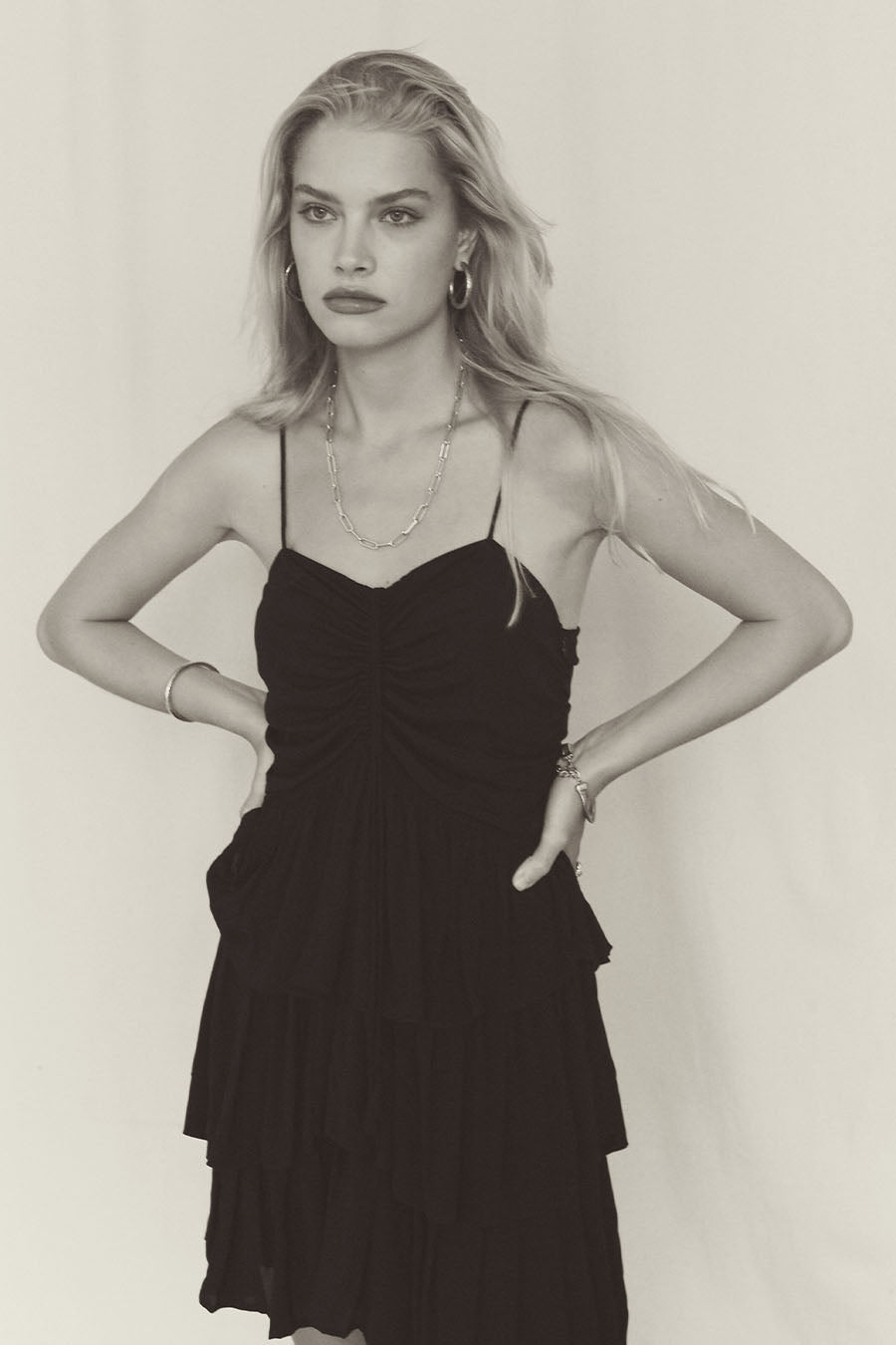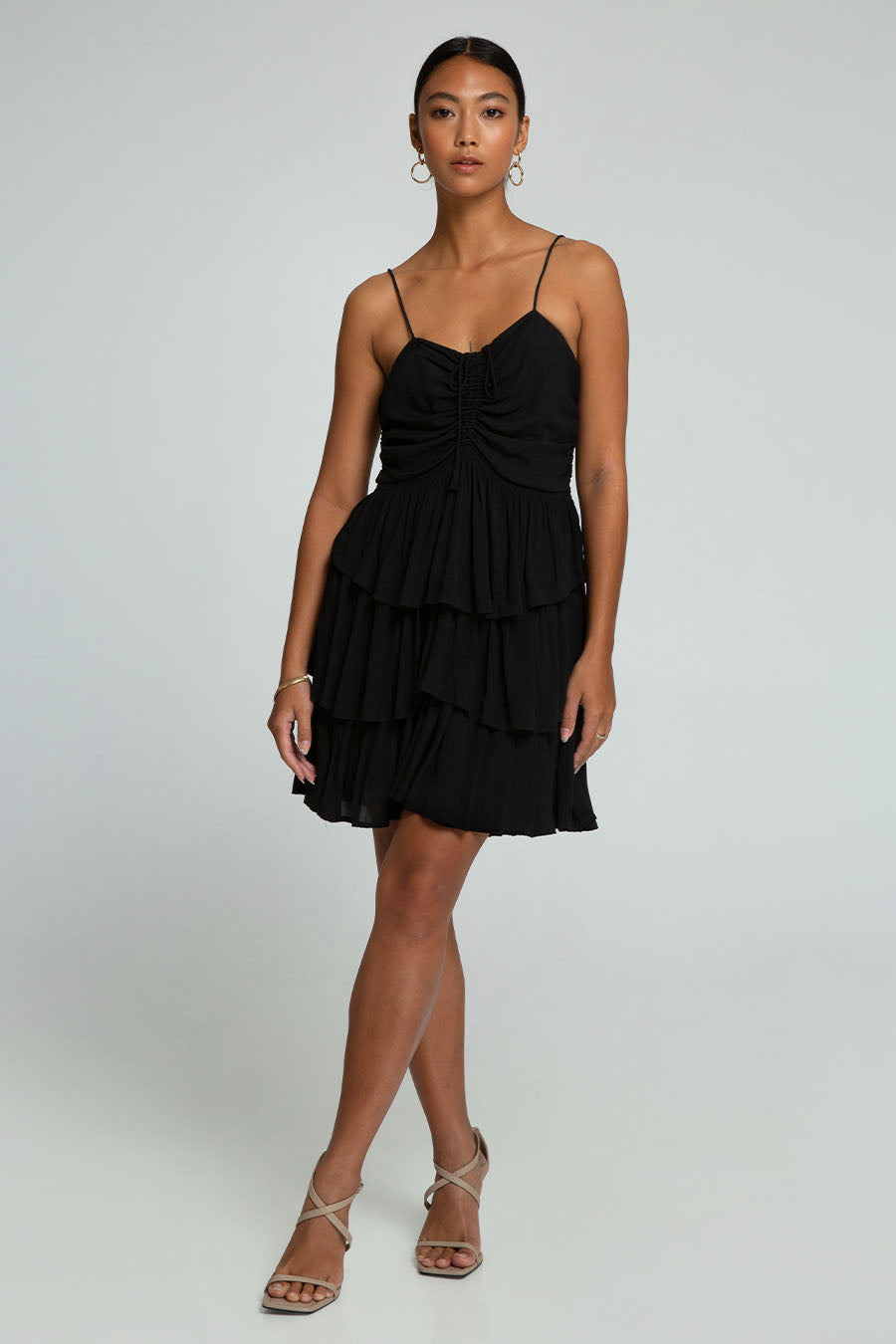 The Cassia Mini Dress features a ruched bodice with ruffle detail skirt. Crafted in rayon and finished with a zipper down the back. Playful dress designed for twirling.