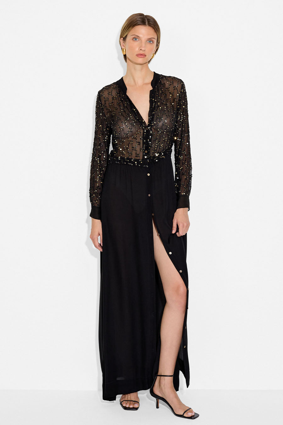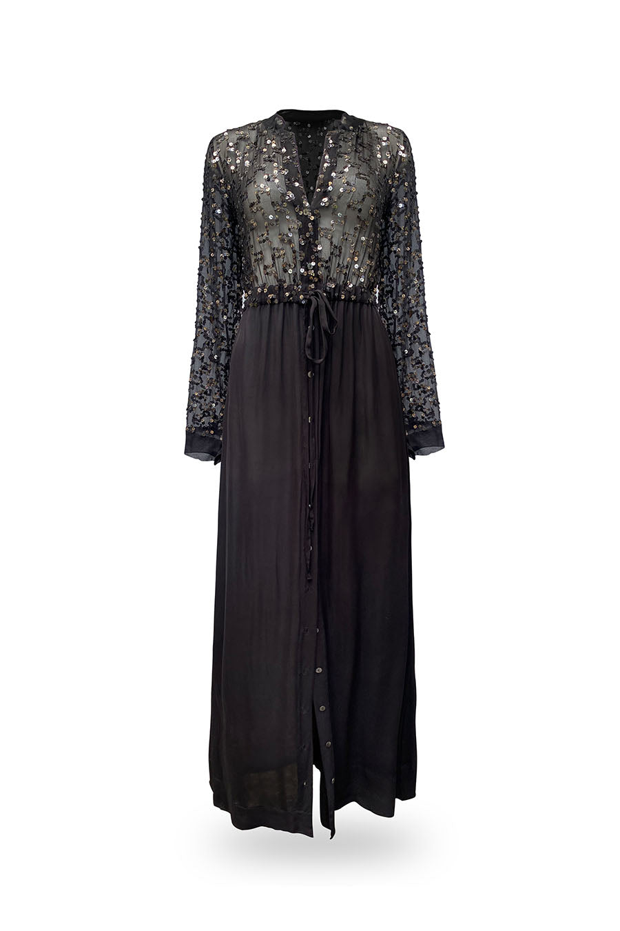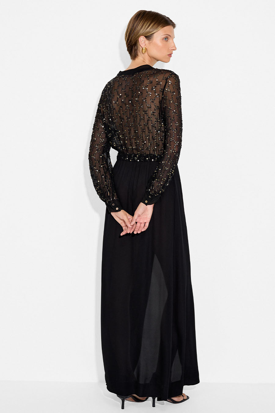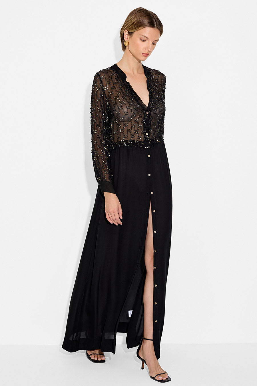 This stunning maxi dress features a fully beaded silk chiffon upper body and a flowing silk crepe skirt. Elegant buttons down the front add a touch of sophistication, making it perfect for special occasions.