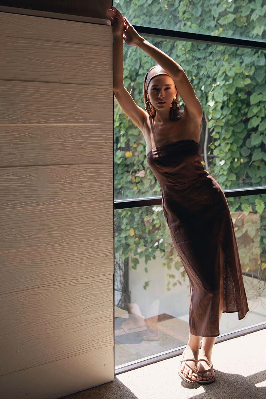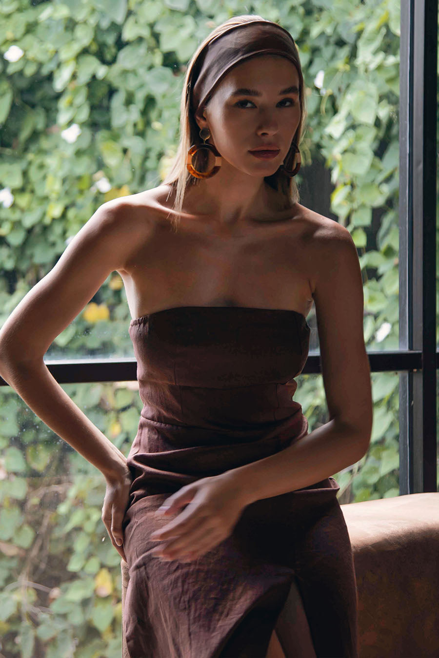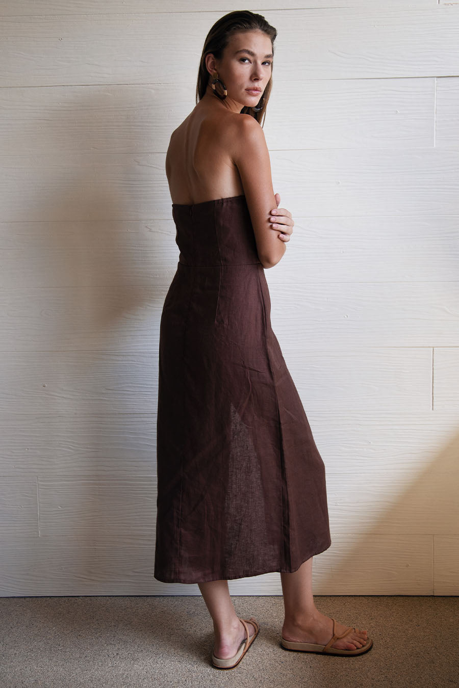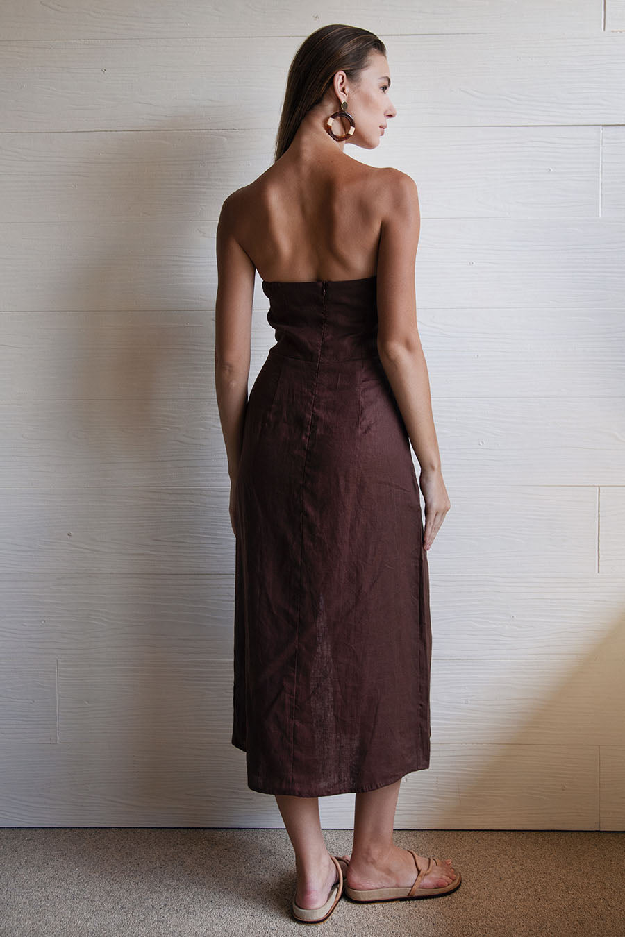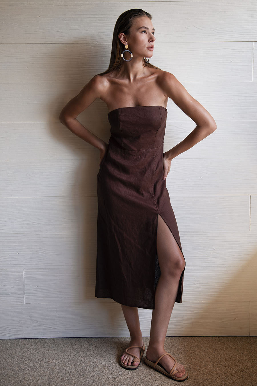 Elevate your wardrobe with the Isa Midi Dress, beautifully crafted from breathable linen in a sophisticated coffee shade. This strapless design offers a sleek and modern silhouette, perfect for both daytime events and elegant evenings. The front split adds a hint of allure, allowing for graceful movement, while the zip closure ensures a seamless fit. Whether you're attending a summer wedding or a casual brunch, the Isa Midi Dress combines timeless style with contemporary charm.