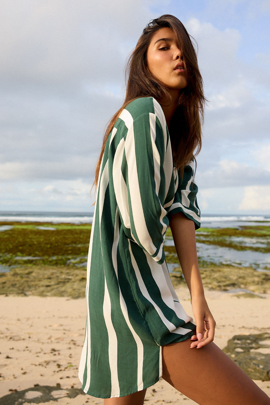 Indulge in our Island Shirt Dress crafted in handmade rayon striped fabric. Featuring delicate shell buttons and an effortlessly silhouette, it's crafted for comfort while enhancing your femininity with every wear.