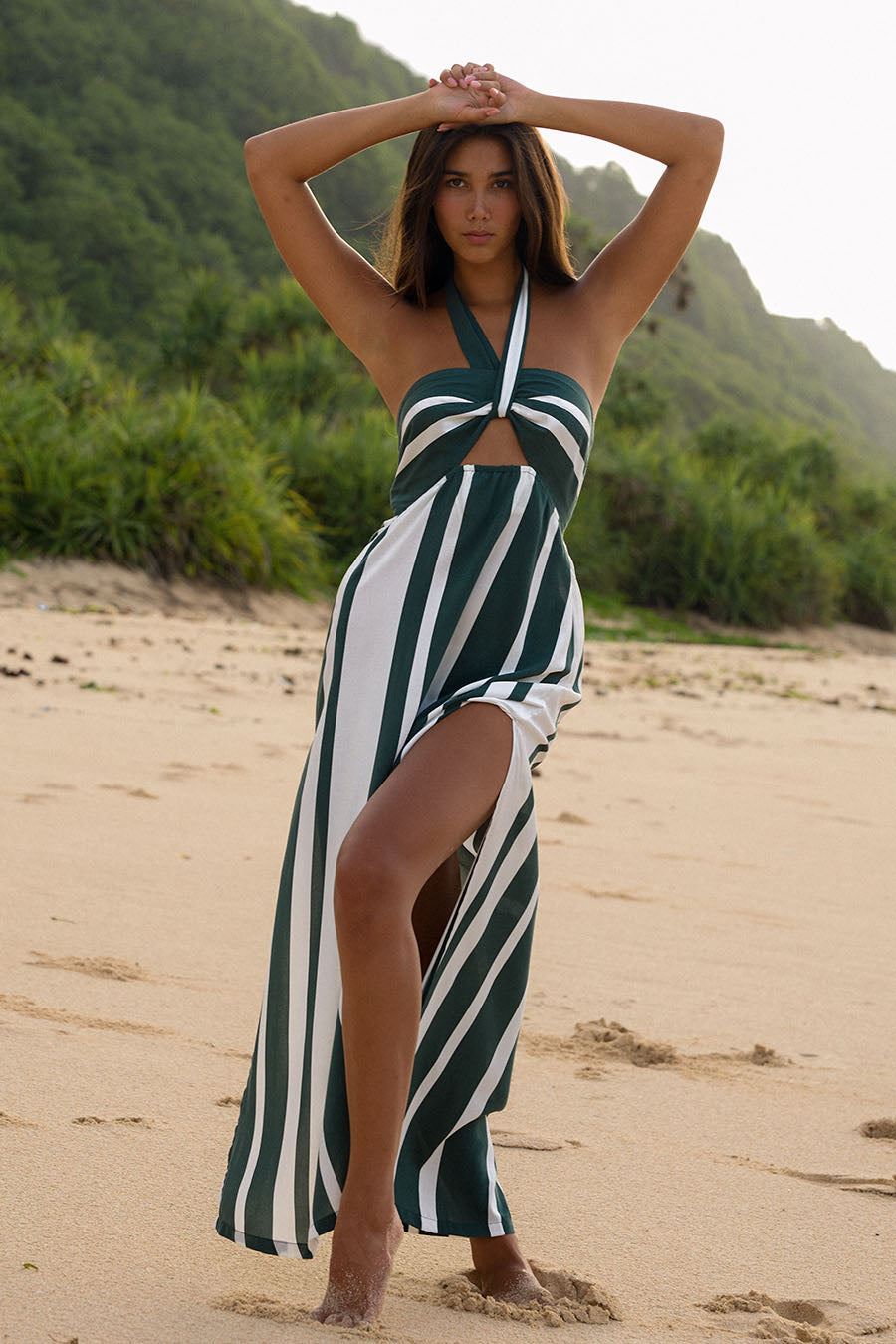 This strapless design features a striped handmade print, splits on the sides and elasticated in the back, ensuring a perfect fit for every body type. Ideal for effortless island elegance wherever you go.