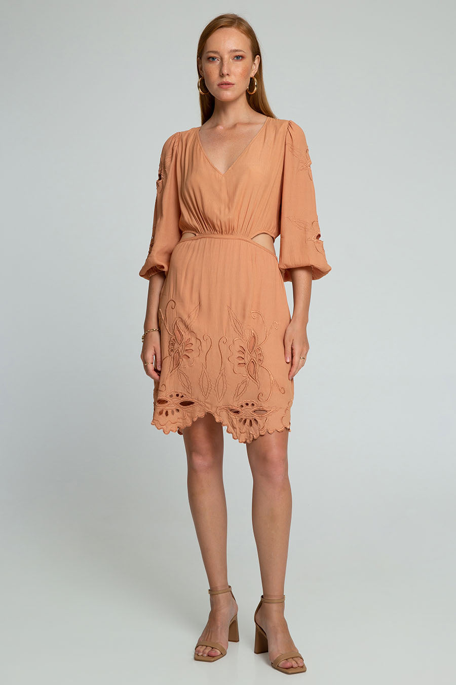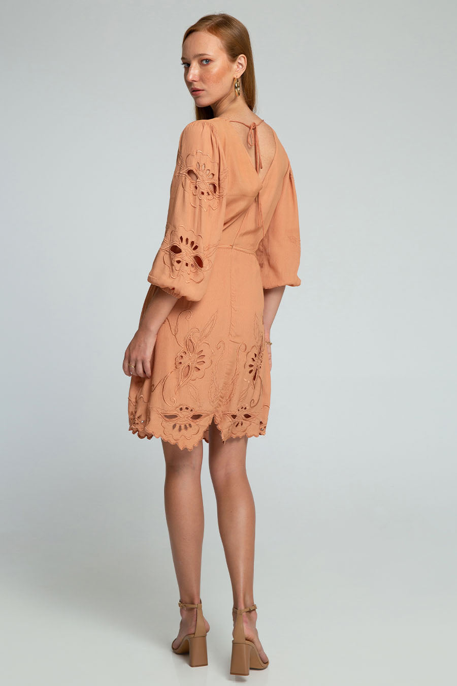 Kara Mini Dress is crafted from rayon and adorned with our signature hand cut-out embroidery around hem and sleeves. The dress features a V-neckline, elasticated 3/4 sleeves and zipper at down back. Each dress takes 2 weeks for our Bali artisans to embroidery by hand.
