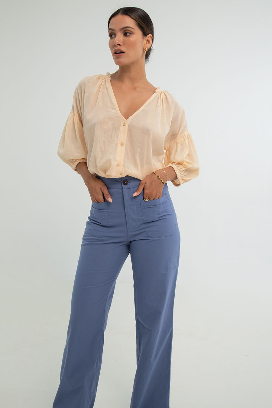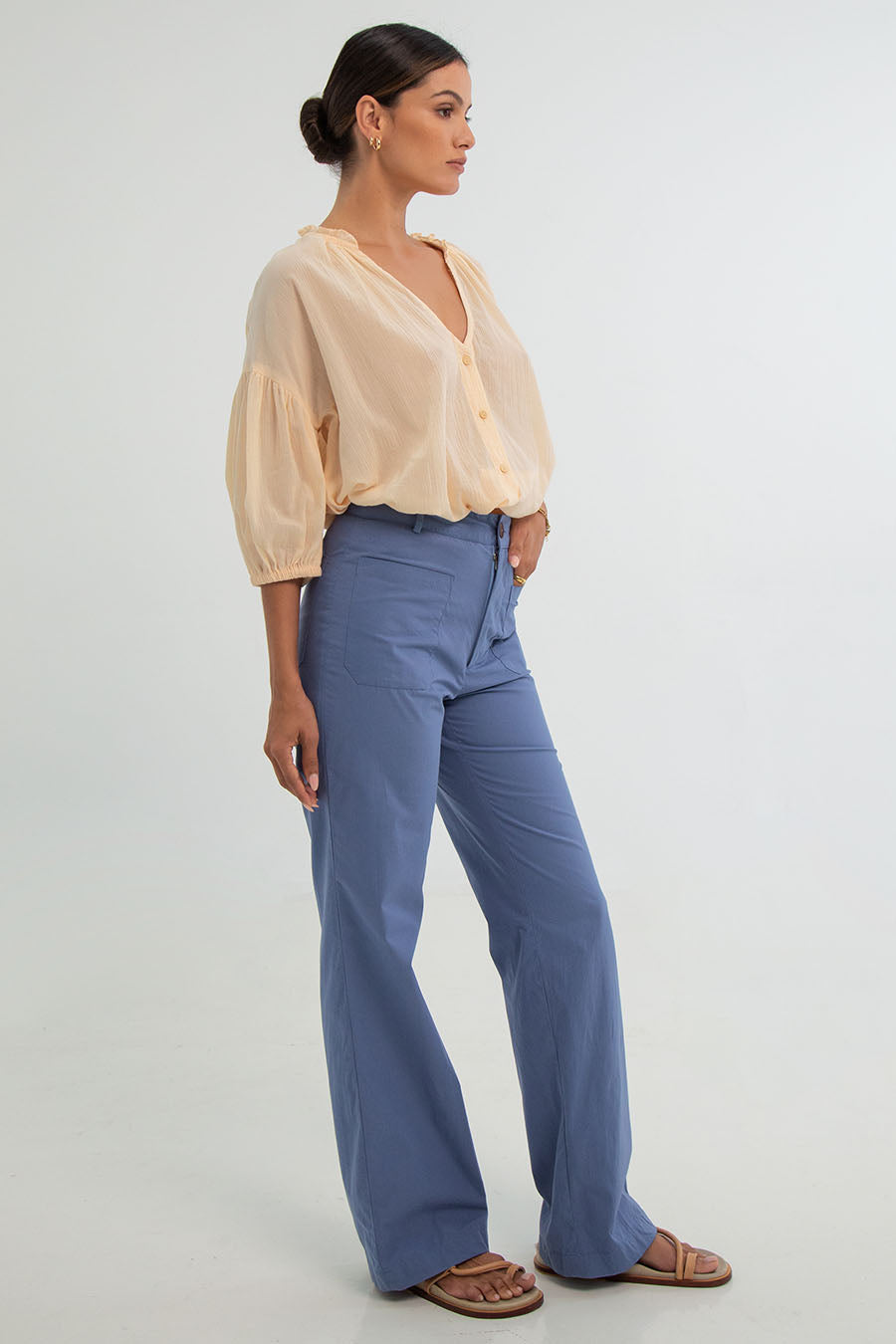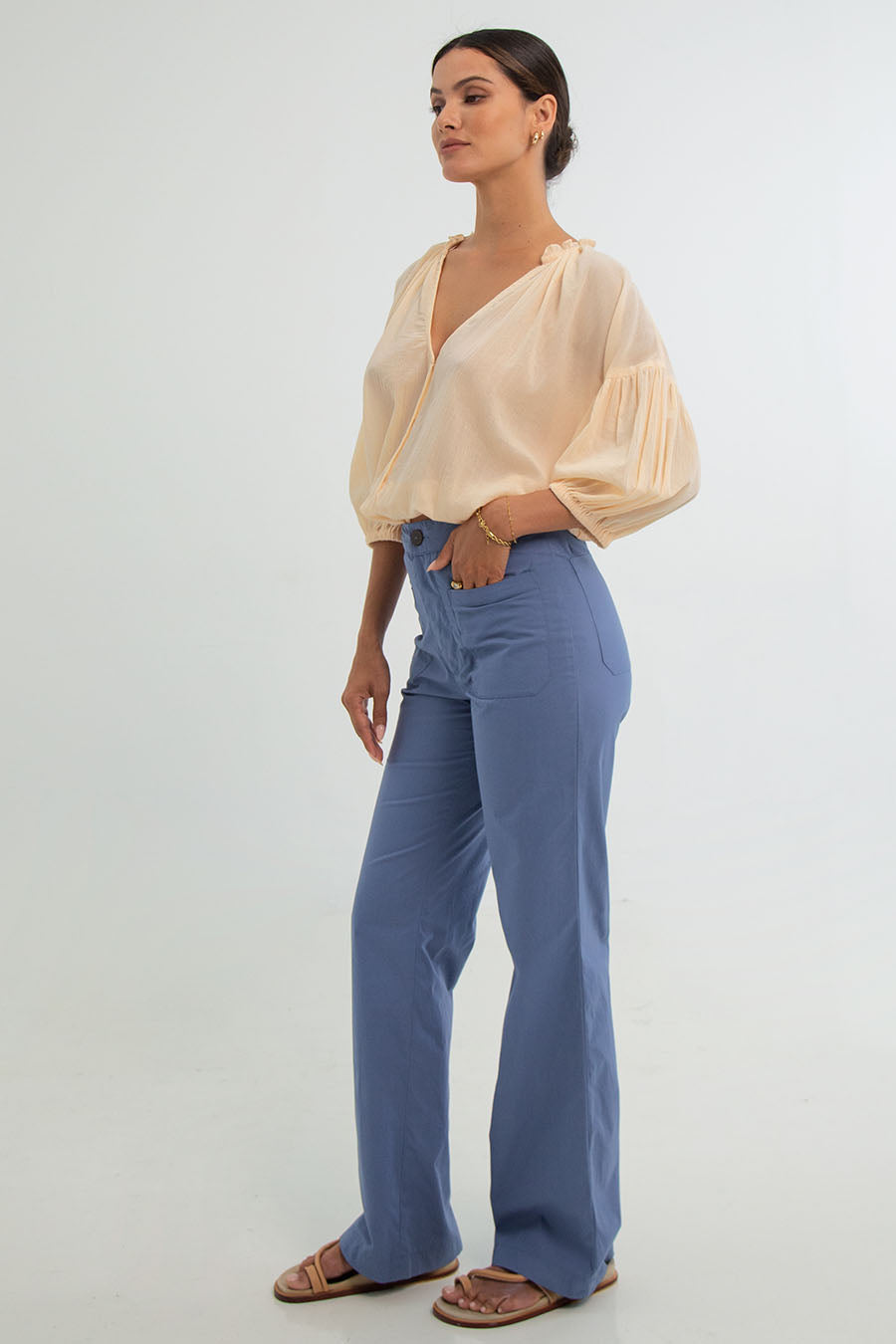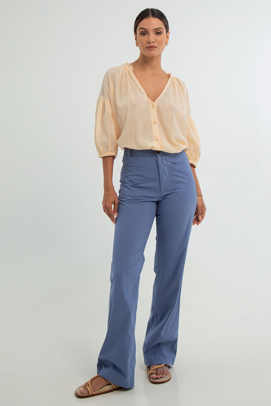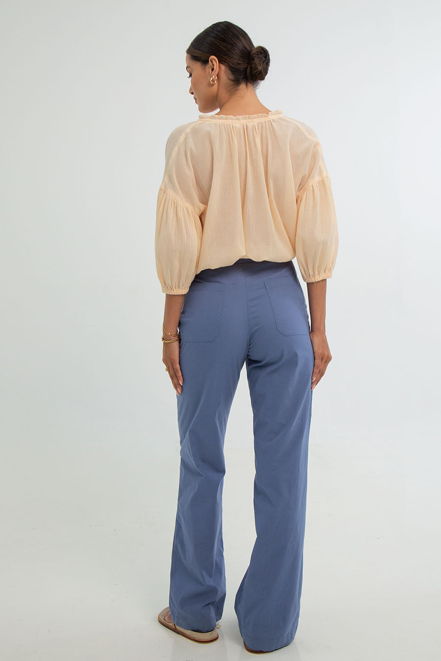Elevate your style with Layla Pants, crafted in cotton popelin. These high-waisted pants offer a touch of 70's flair, exceptional comfort, a perfect fit, zipper closure, front and back pockets ,and a stylish wide-leg silhouette.