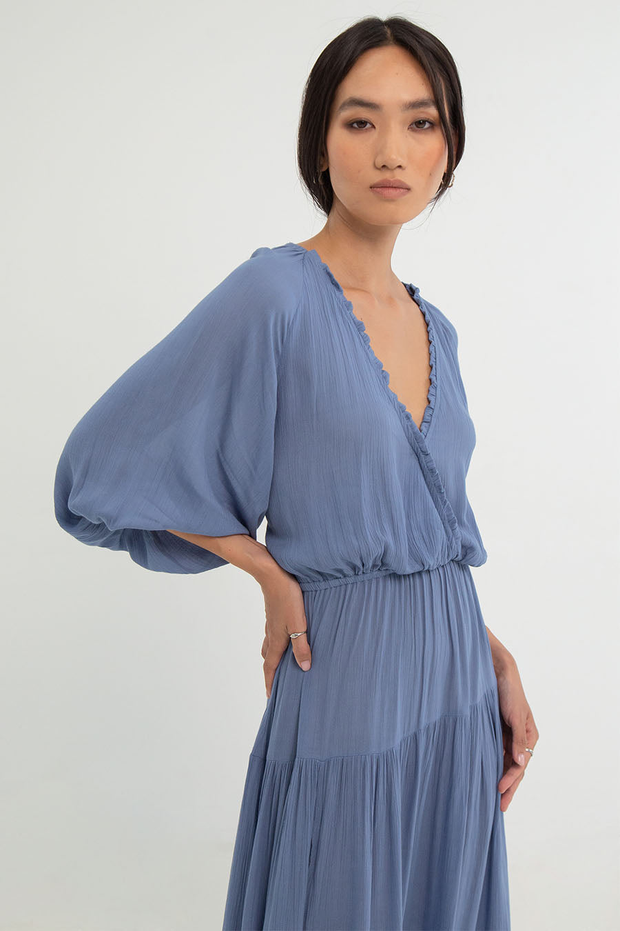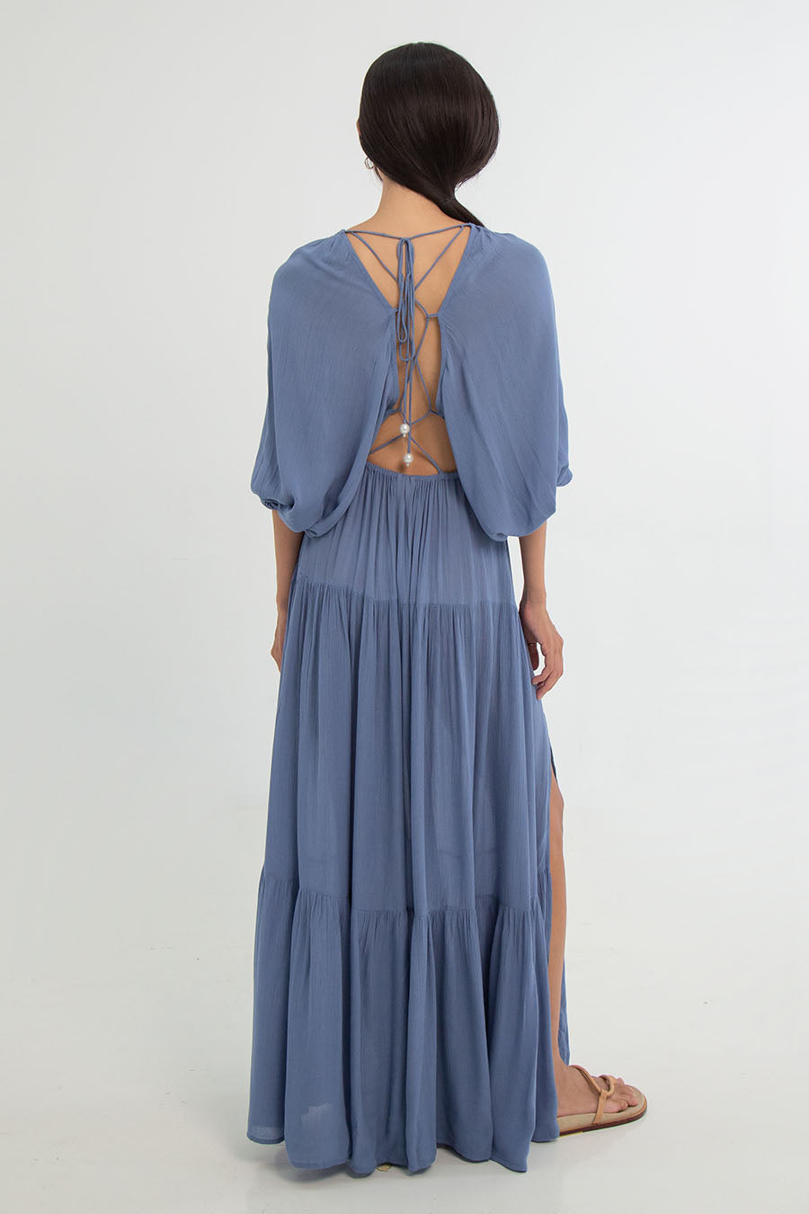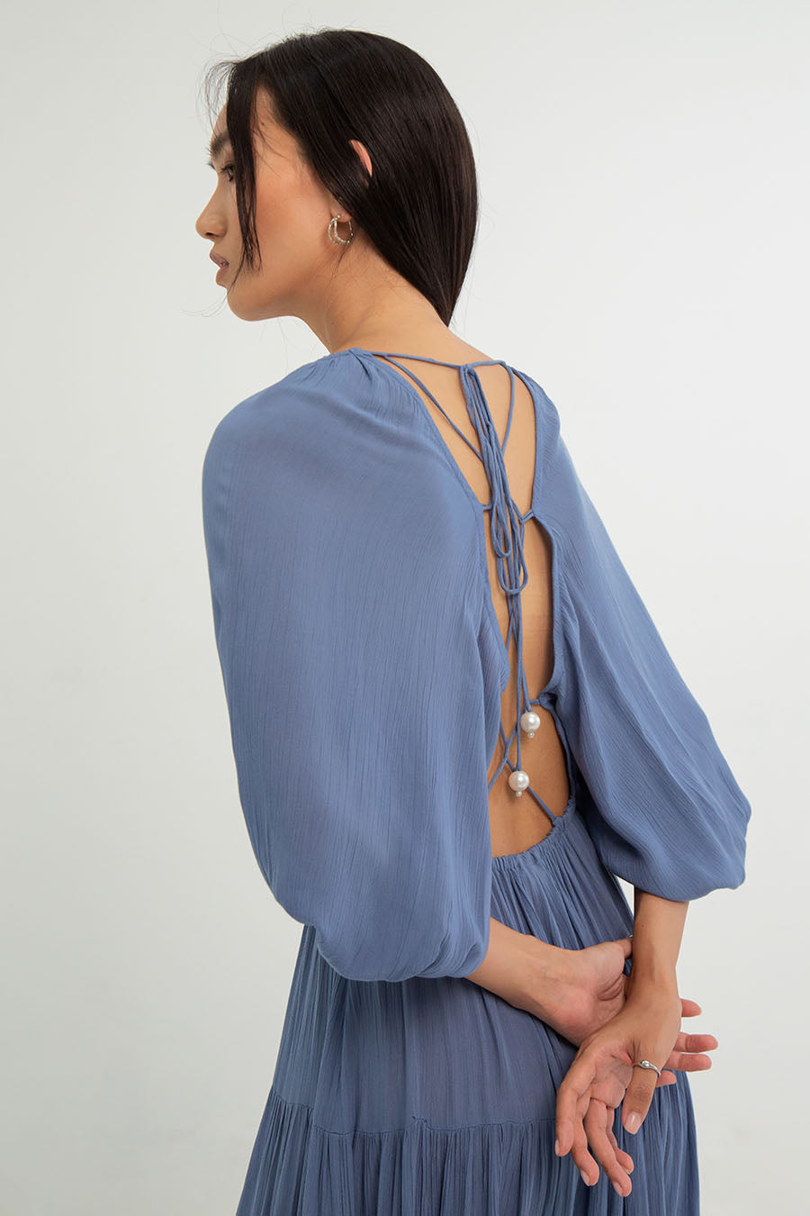 The Milena Maxi is a dress that suits everybody. Crafted from soft rayon crinkle, this style offers a slightly balloon sleeves, a V neckline with tiny ruffle details along V neckline. Make a statement in this timeless style - features a beautiful open-back with criss-cross straps that adjust to your liking and an extra pearls detail adding an unique touch.
