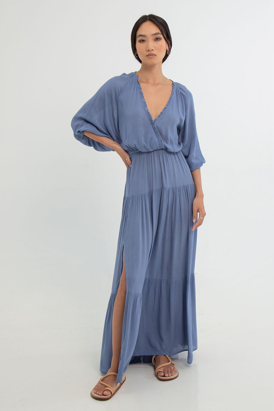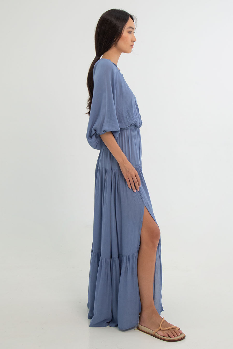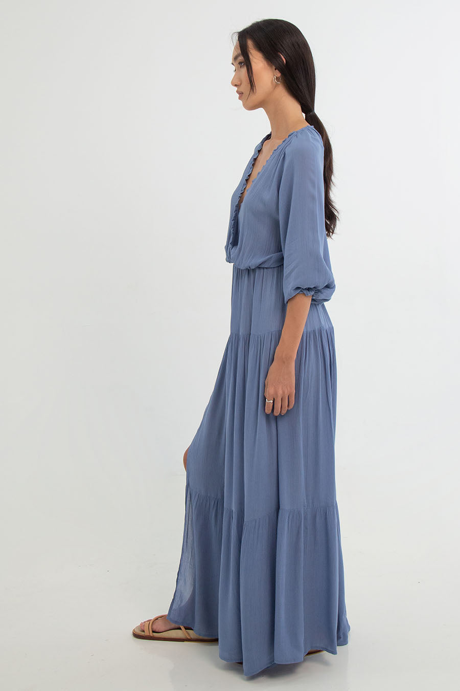 The Milena Maxi is a dress that suits everybody. Crafted from soft rayon crinkle, this style offers a slightly balloon sleeves, a V neckline with tiny ruffle details along V neckline. Make a statement in this timeless style - features a beautiful open-back with criss-cross straps that adjust to your liking and an extra pearls detail adding an unique touch.