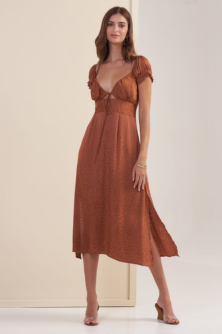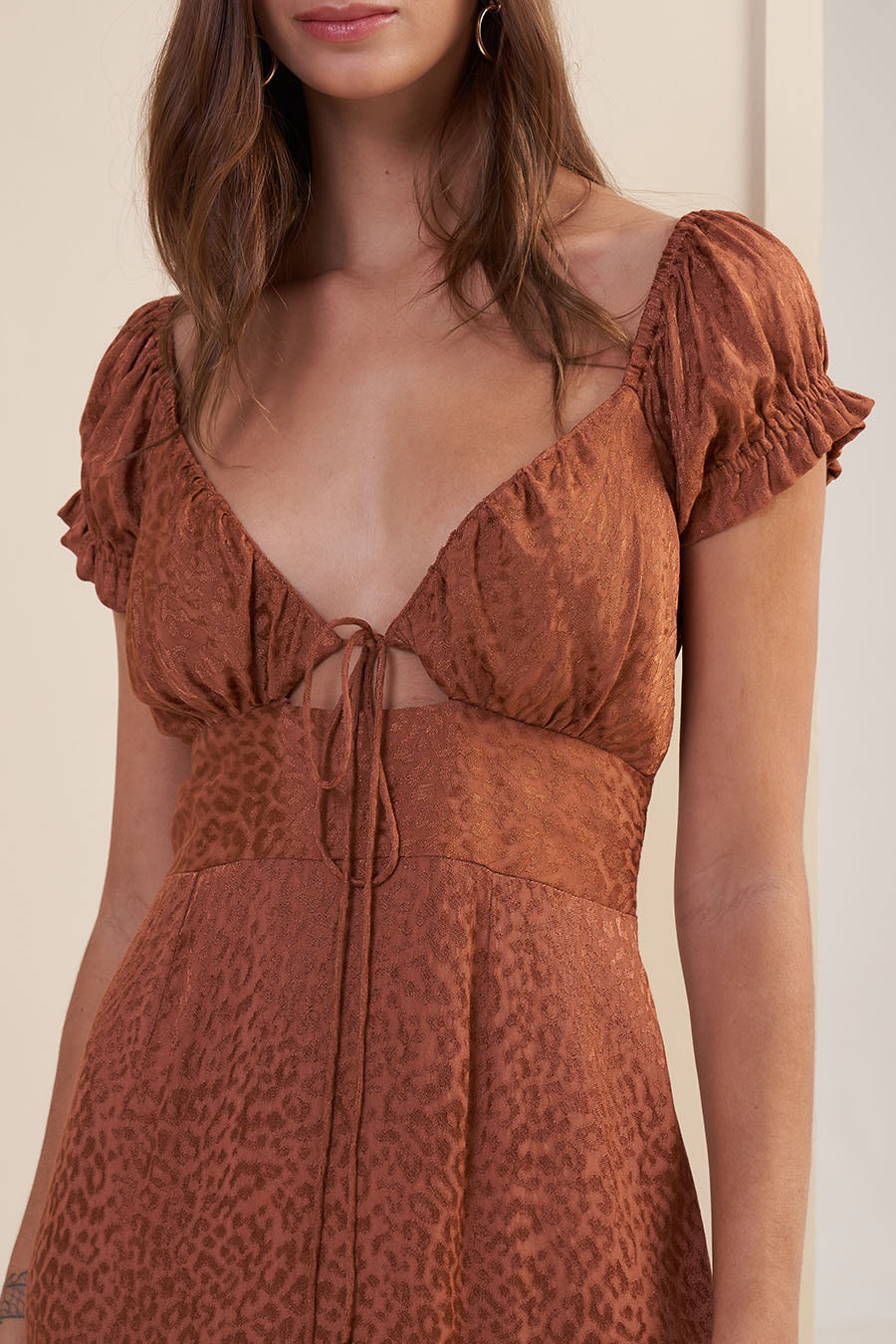 Crafted from a leopard textured rayon fabric, this feminine Tara dress feature slightly puffed sleeve and slit details on the side.