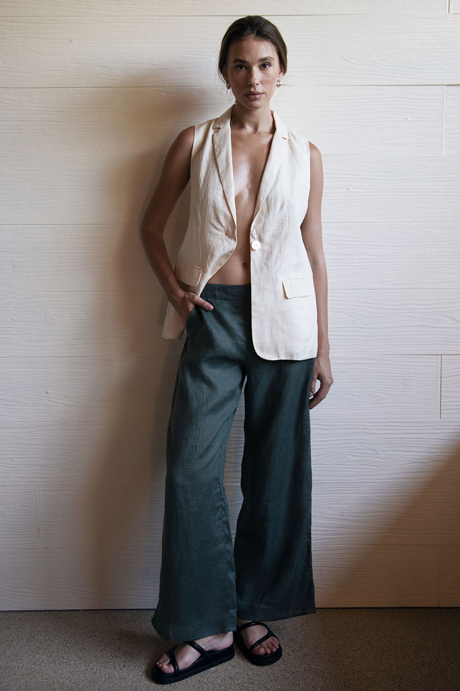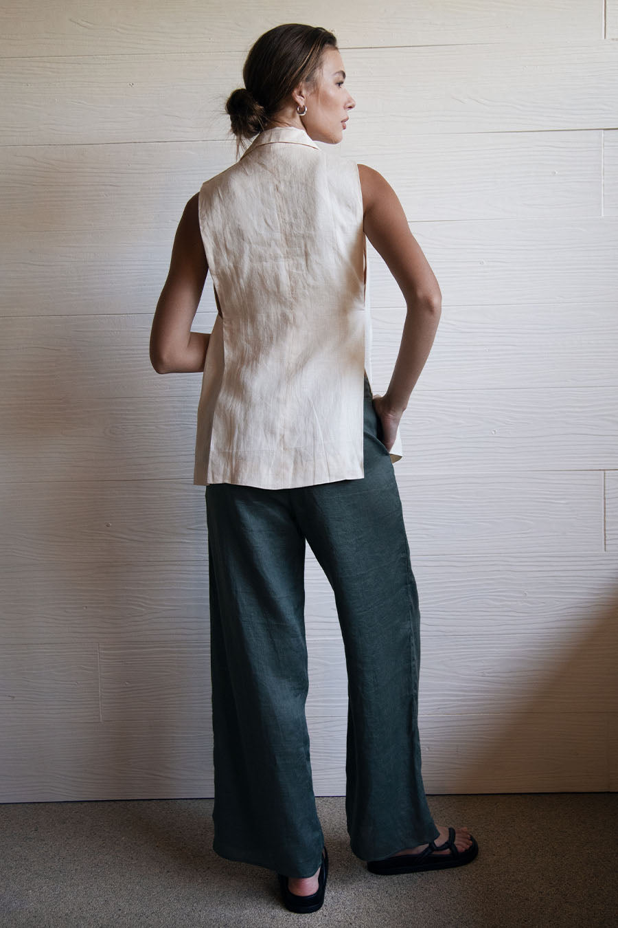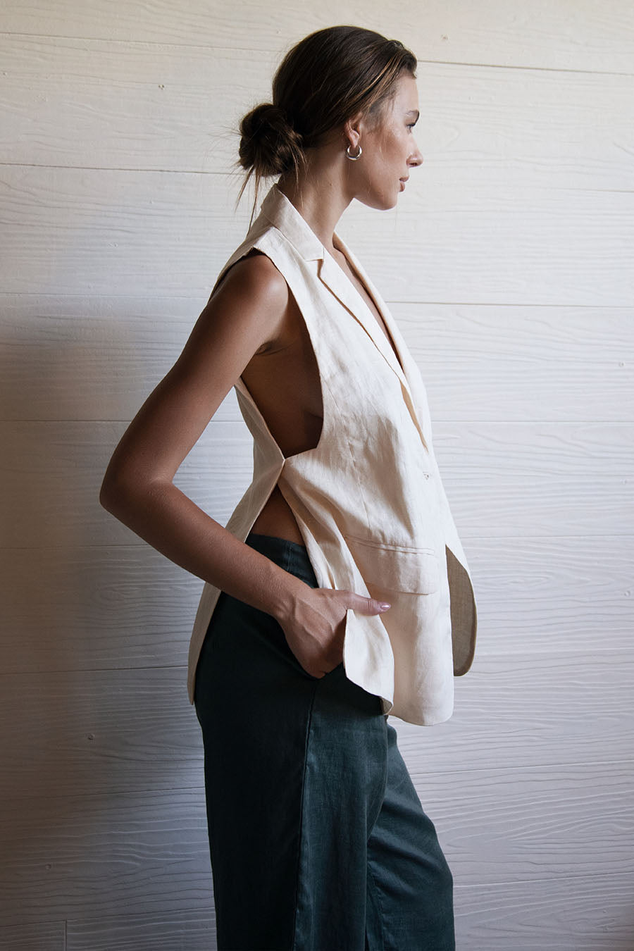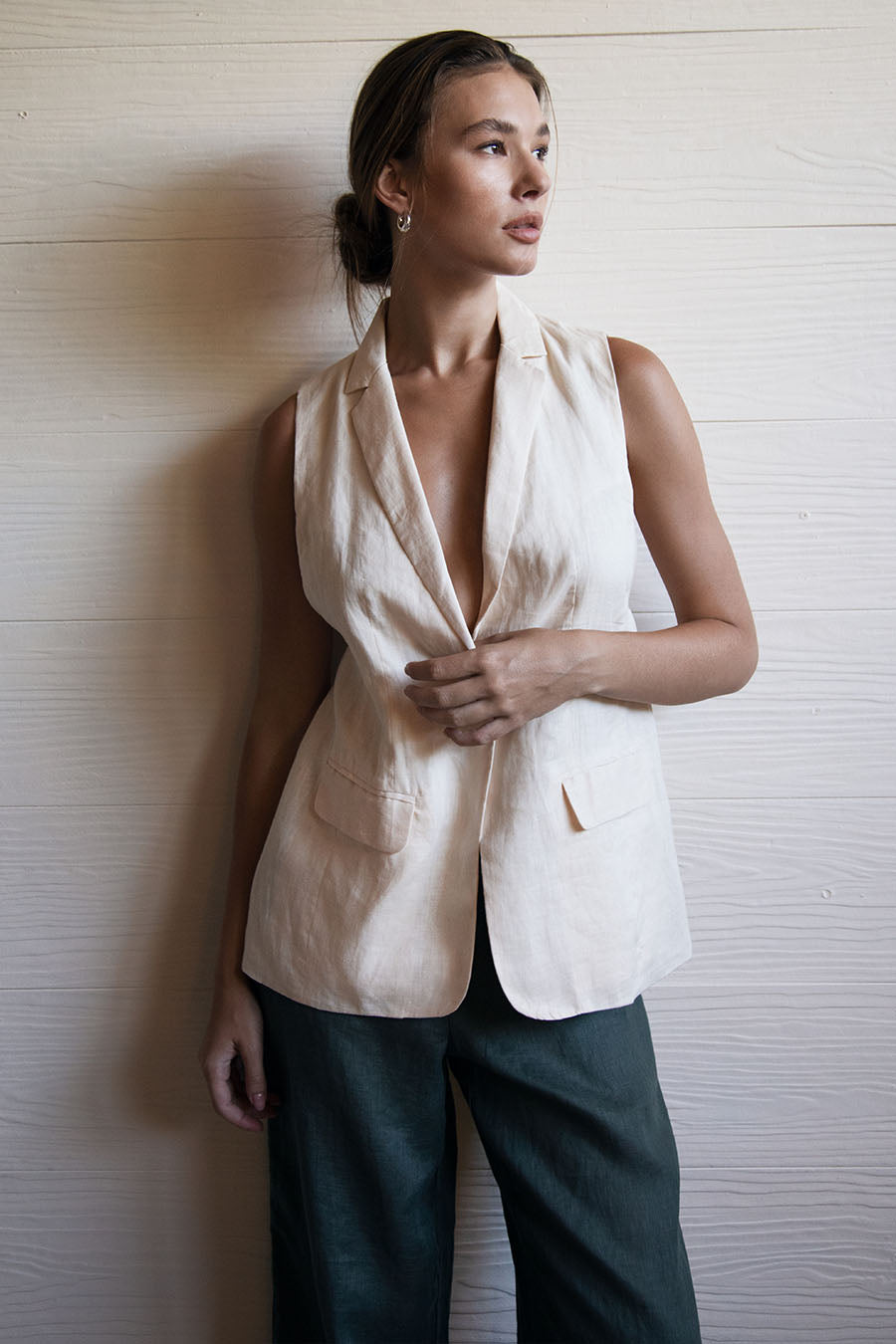 Craft an effortlessly chic look with the Allure Waistcoat in soft Buttermilk. This elegant piece is beautifully crafted from premium linen, ensuring both comfort and durability. Featuring stylish front pockets and a statement button that adds a classic touch, this waistcoat is distinguished by its open sides, lending a modern flair to its traditional silhouette. Perfect for layering over a sleek blouse or a casual tee, the Allure Waistcoat elevates any outfit with its sophisticated design and neutral palette.