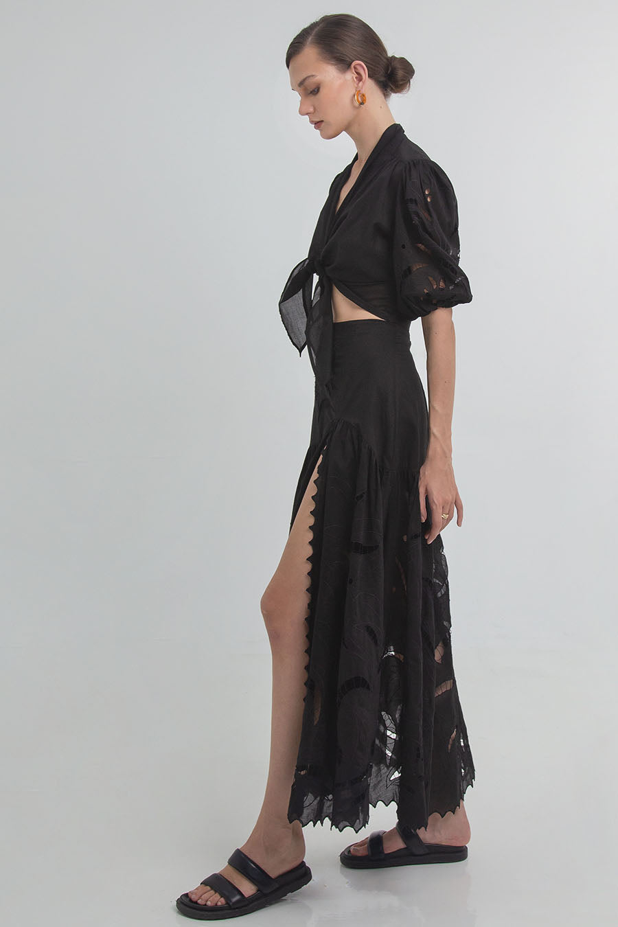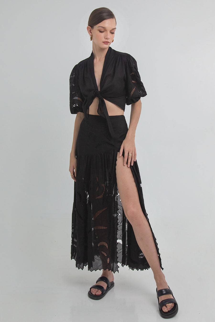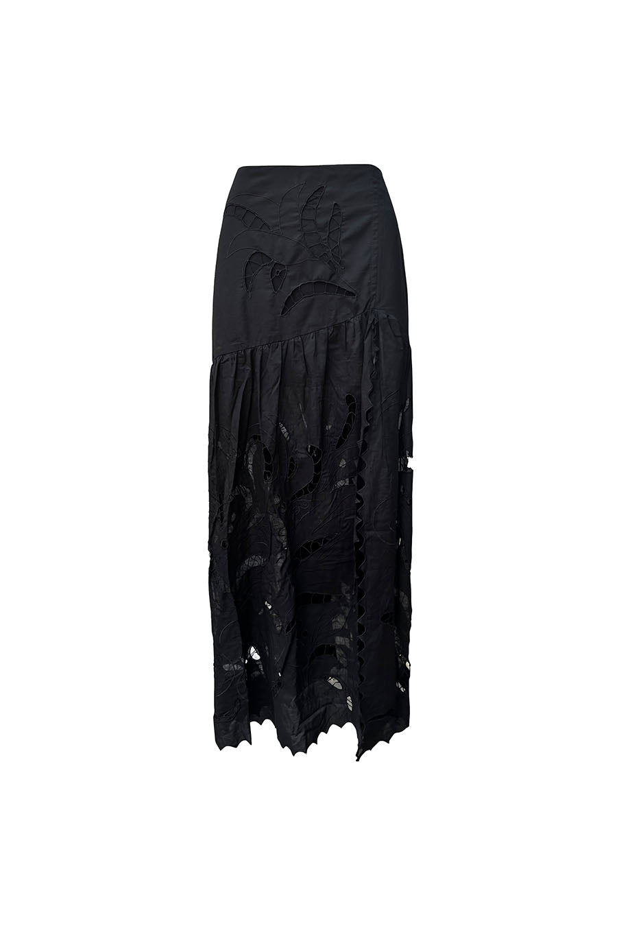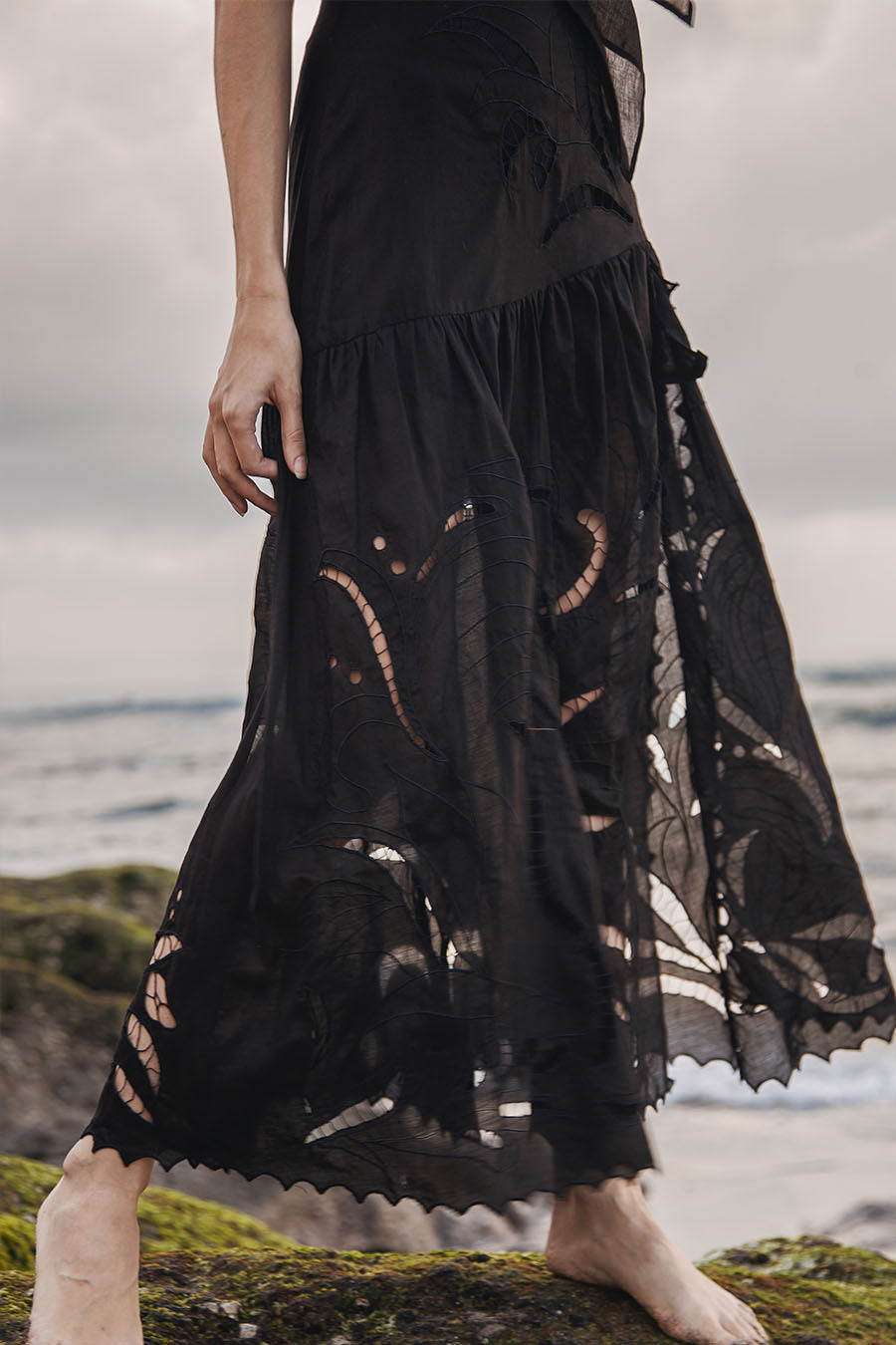 Crafted in cotton, the Alya Maxi Skirt features a unique leg split design adorned with exquisite Balinese cut-out hand embroidery throughout. Elevate your style effortlessly blending traditional artistry with modern fashion.