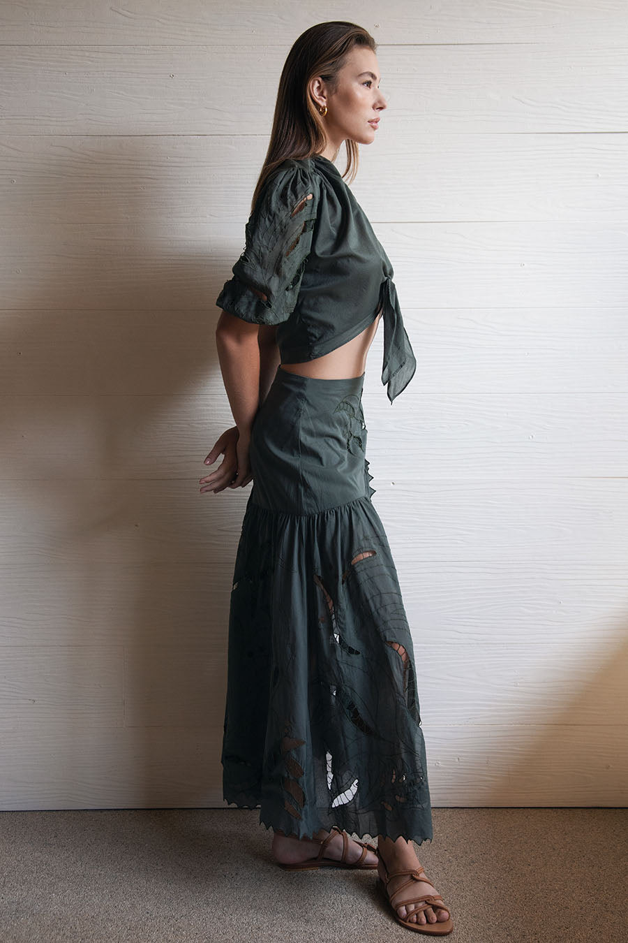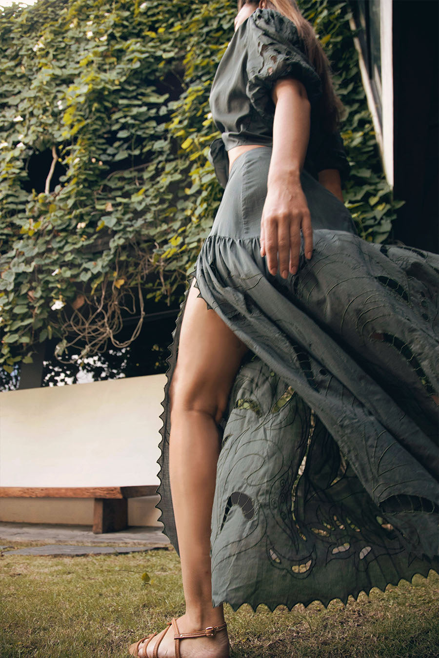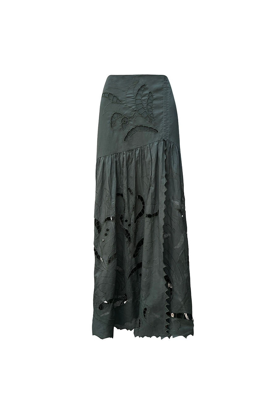 Step into style with the Ayla Maxi Skirt, designed in an eye-catching Chrome Green. This mid-waist skirt captivates with its unique motif cut-out embroidery, offering both elegance and a hint of edginess. The daring split adds a touch of allure, making it perfect for transforming from daywear to a sophisticated evening look. Its flowing silhouette and detailed artistry ensure that this skirt stands out in any setting.