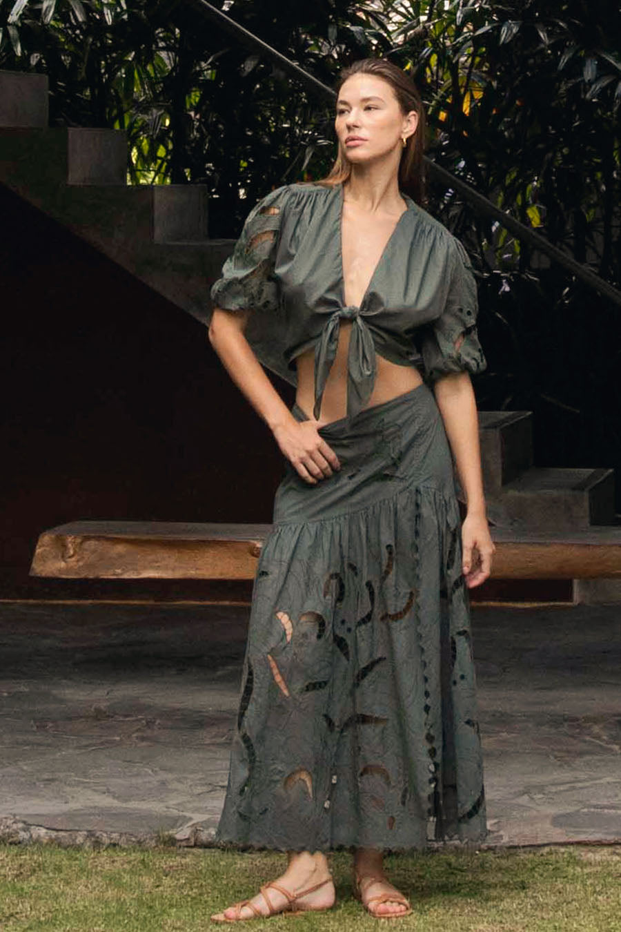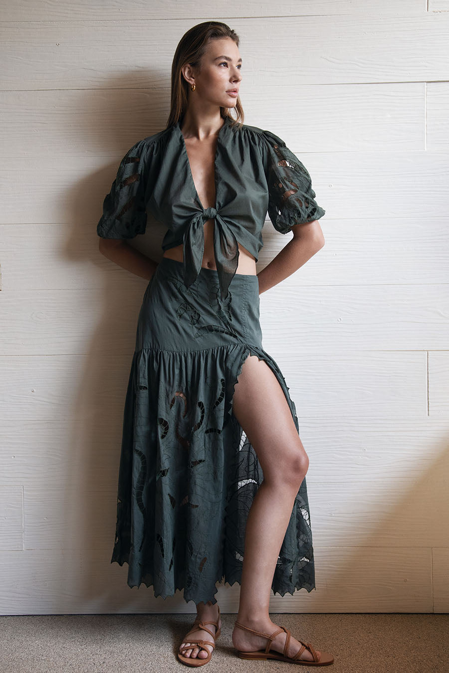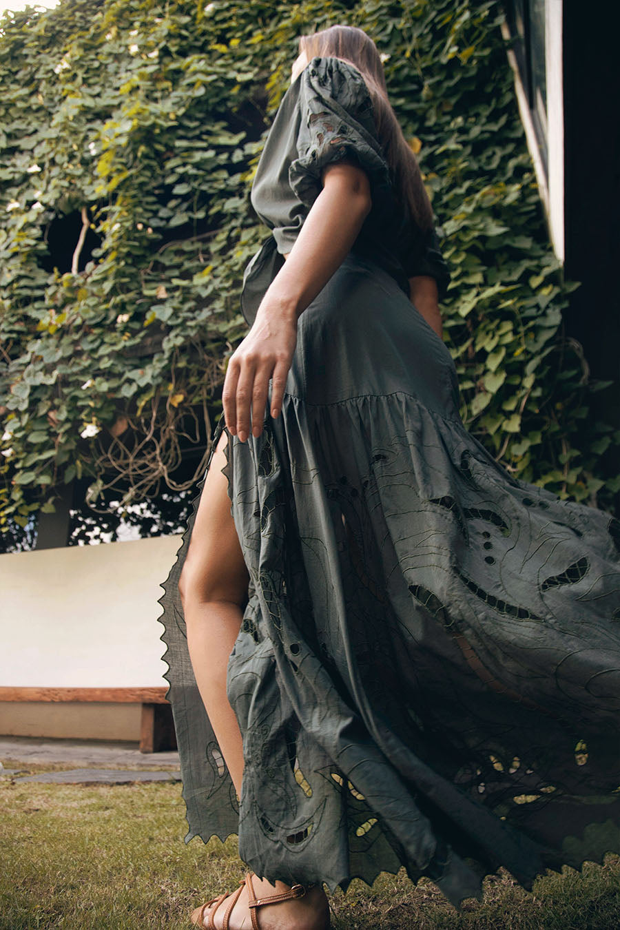 Step into style with the Ayla Maxi Skirt, designed in an eye-catching Chrome Green. This mid-waist skirt captivates with its unique motif cut-out embroidery, offering both elegance and a hint of edginess. The daring split adds a touch of allure, making it perfect for transforming from daywear to a sophisticated evening look. Its flowing silhouette and detailed artistry ensure that this skirt stands out in any setting.