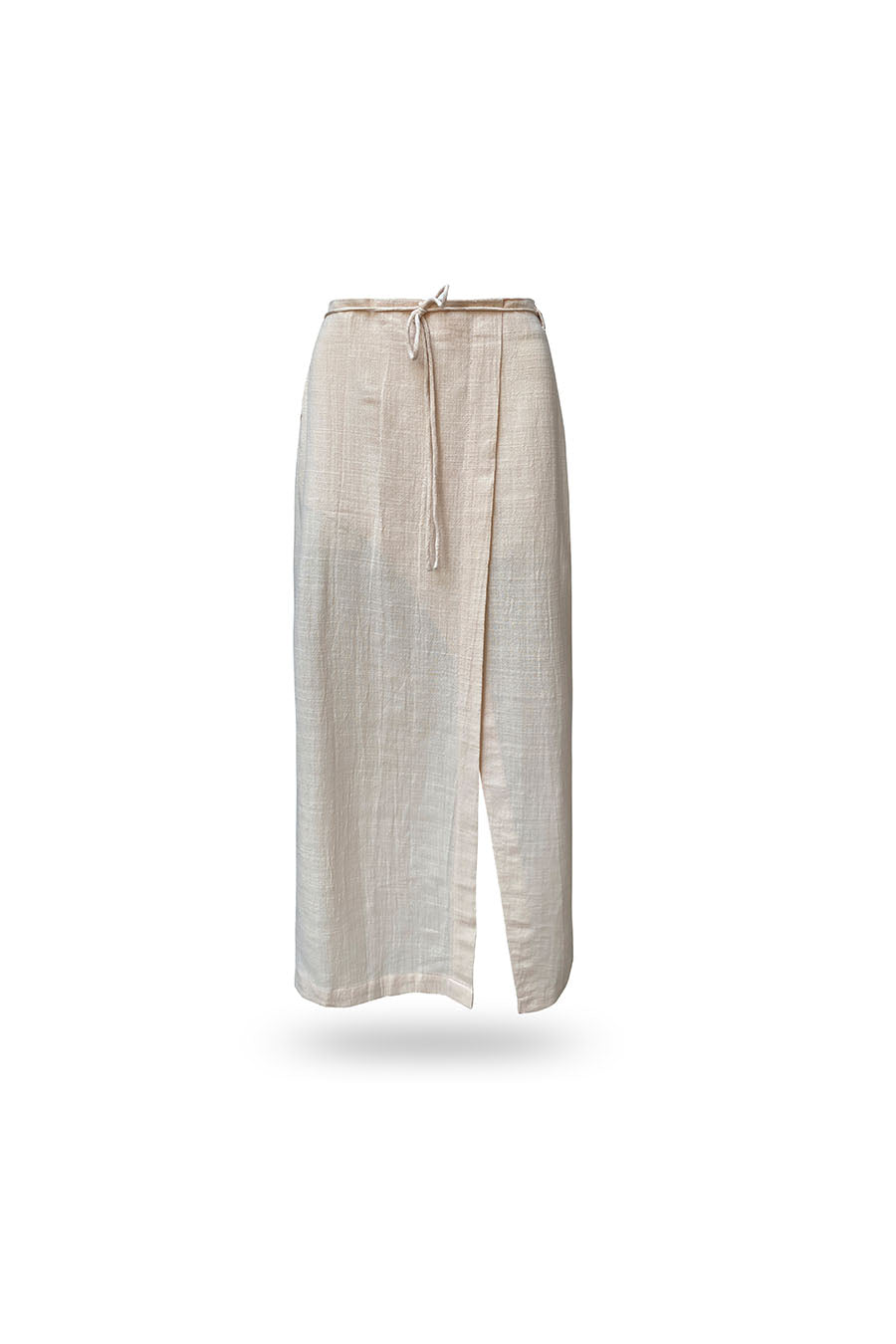 Maxi skirt in breathable cotton-linen blend, featuring zipper, a stylish front split, and a detachable belt for versatile styling.