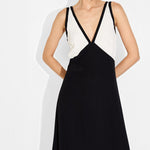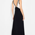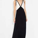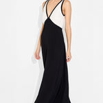 The Twilight Dress, a maxi shape featuring a flattering V-neck with contrast panelling around. It has a V-shaped also flowing throw the back and a slip-style silhouette that falls effortlessly in line with the body. Crafted from soft rayon fabric in black and white, it’s the perfect dress for any occasion.