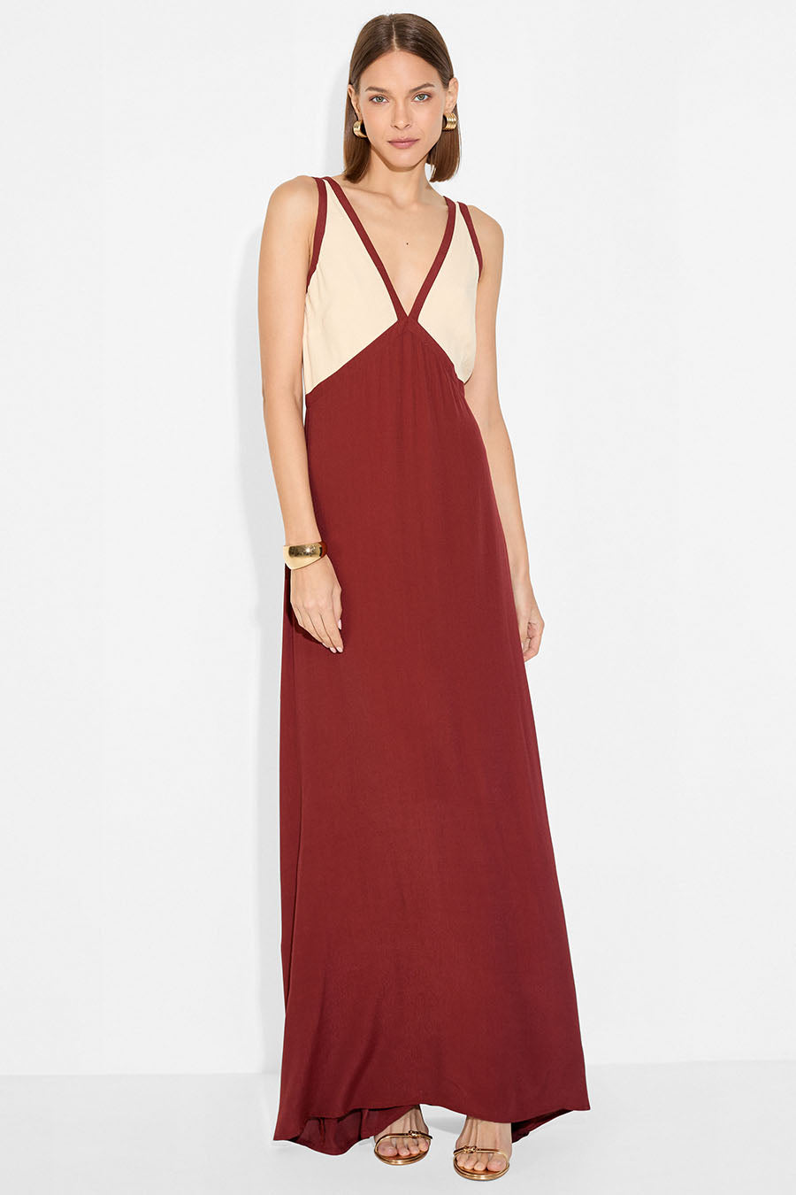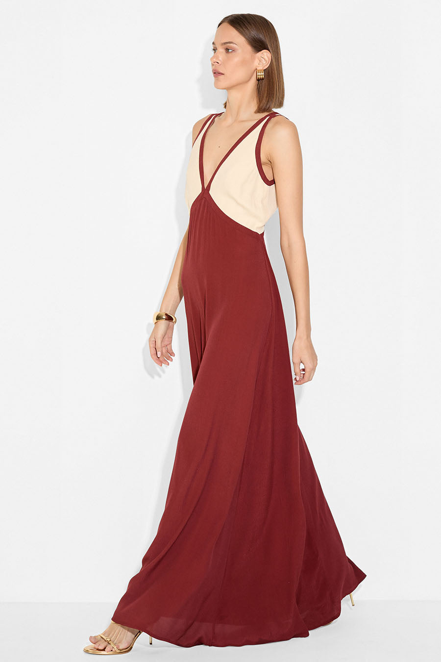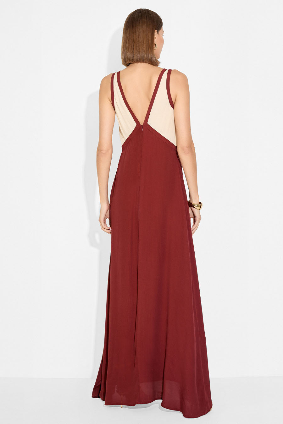 The Twilight Dress, a maxi shape featuring a flattering V-neck with contrast panelling around. It has a V-shaped also flowing throw the back and a slip-style silhouette that falls effortlessly in line with the body.
