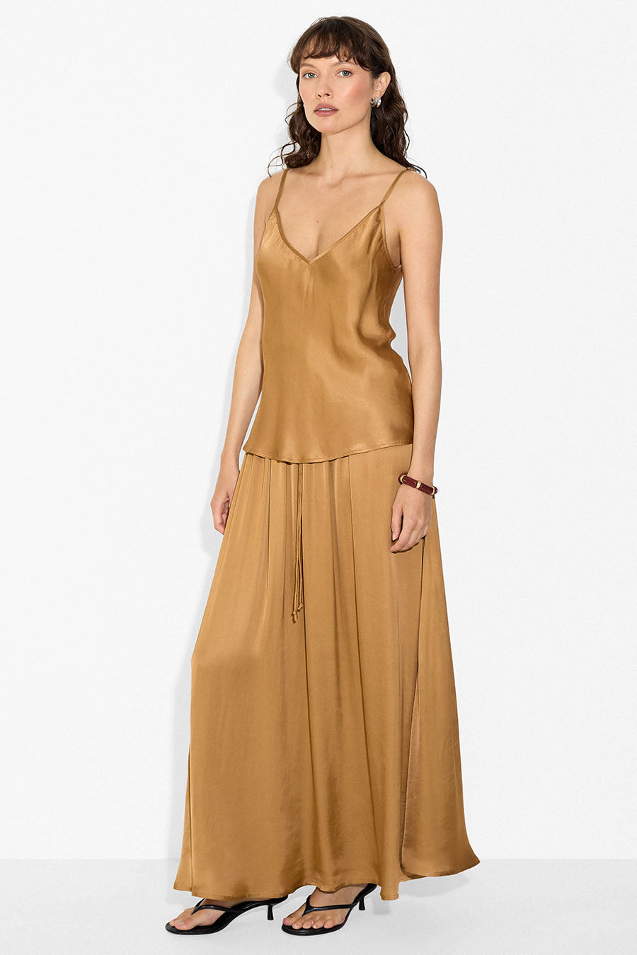 The Ember Maxi Skirt is the epitome of effortless elegance. Crafted from soft, breathable viscose with a luxurious silk-like feel, this skirt moves beautifully with every step. It features a mossy gold hue that adds a touch of understated glamour. Designed with a comfortable drawstring waist, it offers a customizable fit while adding a relaxed, bohemian touch. Gently folding and cascading around the body, it creates a graceful silhouette that flatters every shape. Perfect for warm days or sunset evenings, this piece brings both comfort and sophistication.