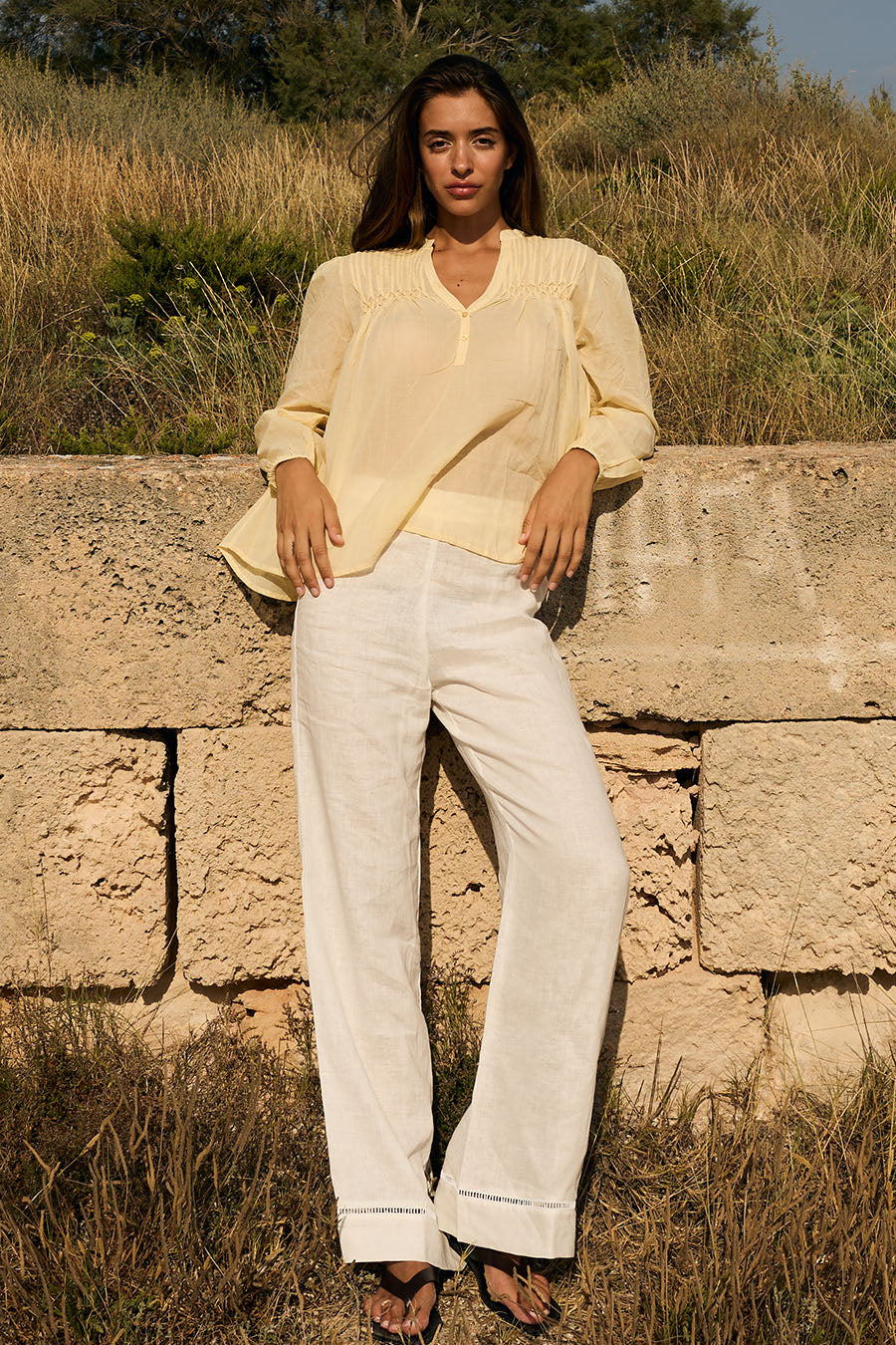 The Naomi Pants feature a long, straight leg silhouette crafted from premium linen for breathable comfort and a refined look. A flattering waistband and sleek side zipper create a structured front. Elastic at the back provides gentle adjustment for a flexible fit that sits comfortably at the waist. Horizontal cutwork with ladder trims at the hem adds a unique, detailed accent. Polished yet relaxed, this versatile piece adds ease and style to any wardrobe.