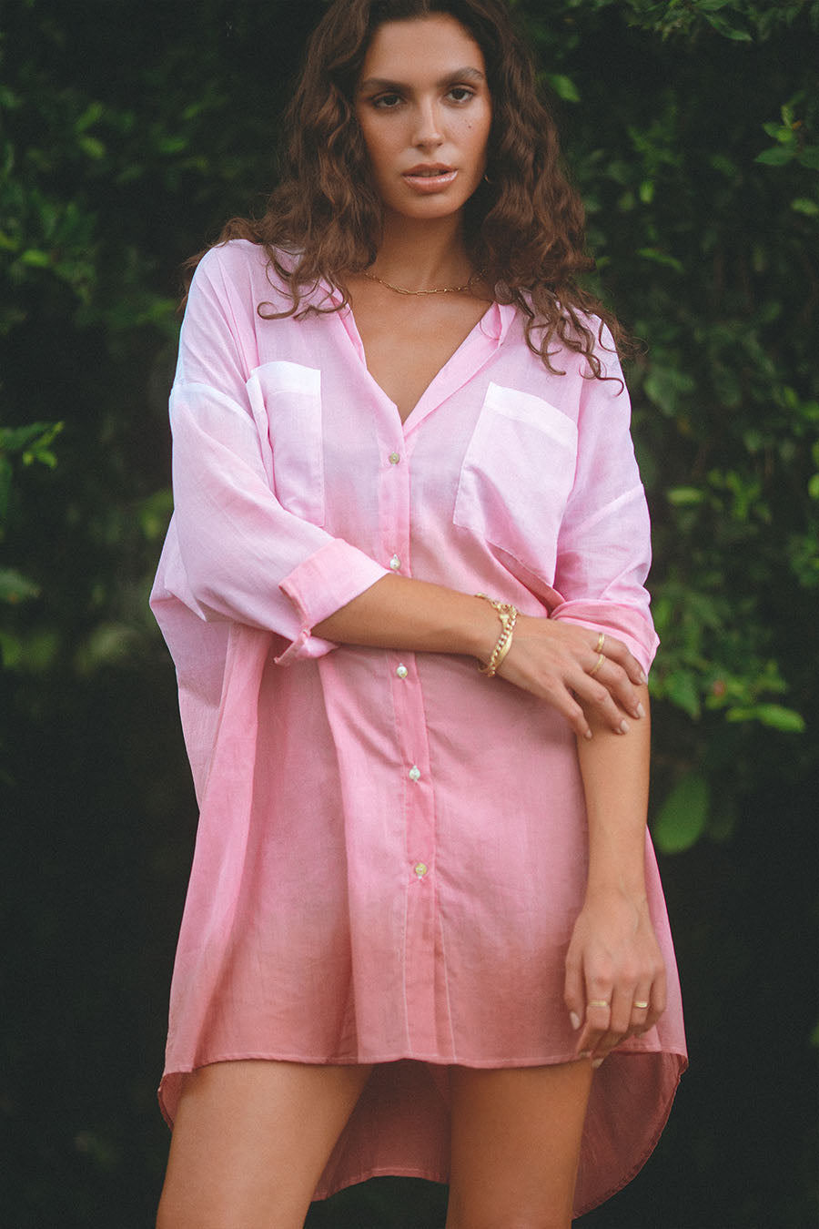 Crafted from a soft and slightly sheer cotton voile, the Faye Shirt Dress features the traditional hand Tie Dye technique, 3/4 length sleeves, shell buttons at the front and oversized statement pockets.