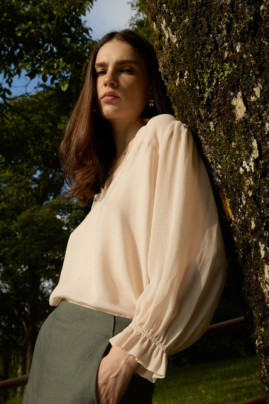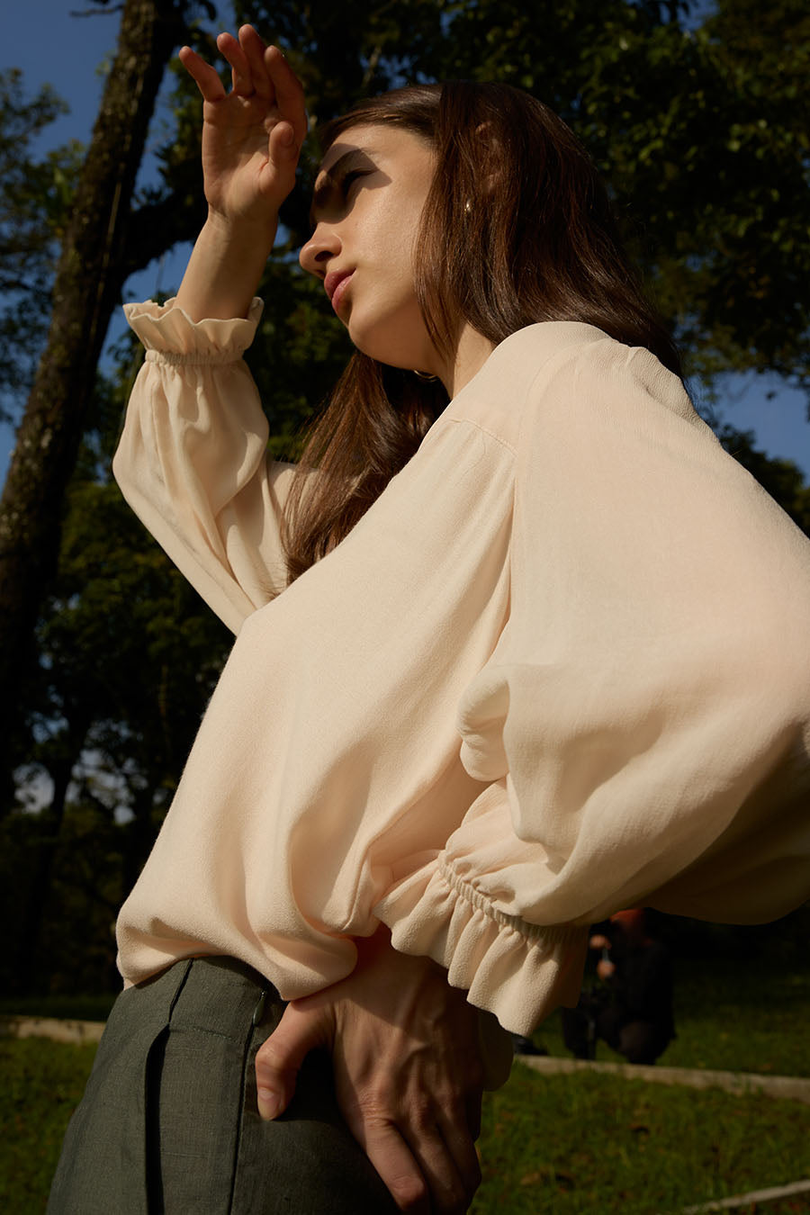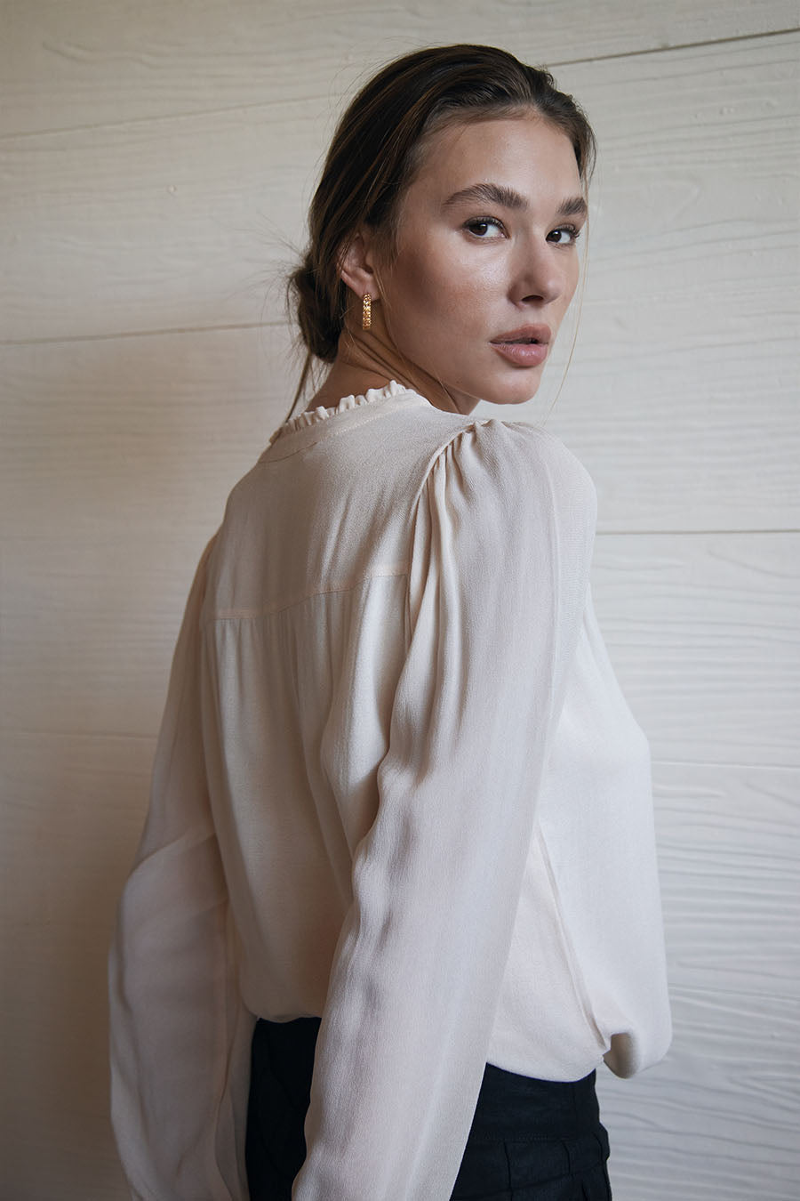 Elevate your look effortlessly with this versatile elegant rayon shirt. Features elasticated long sleeves and delicate ruffle details around the neckline, it offers a perfect balance of simplicity and sophistication.