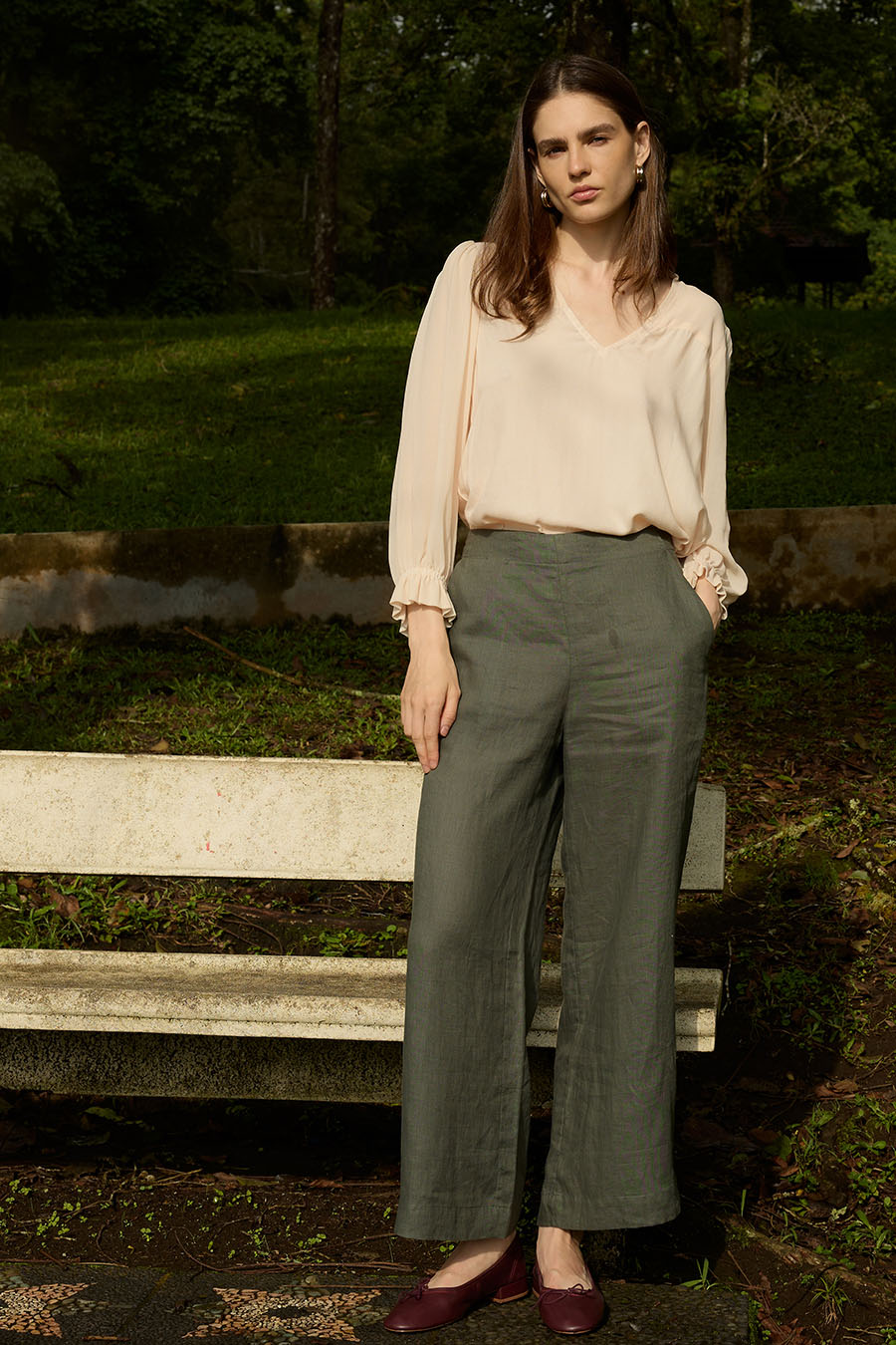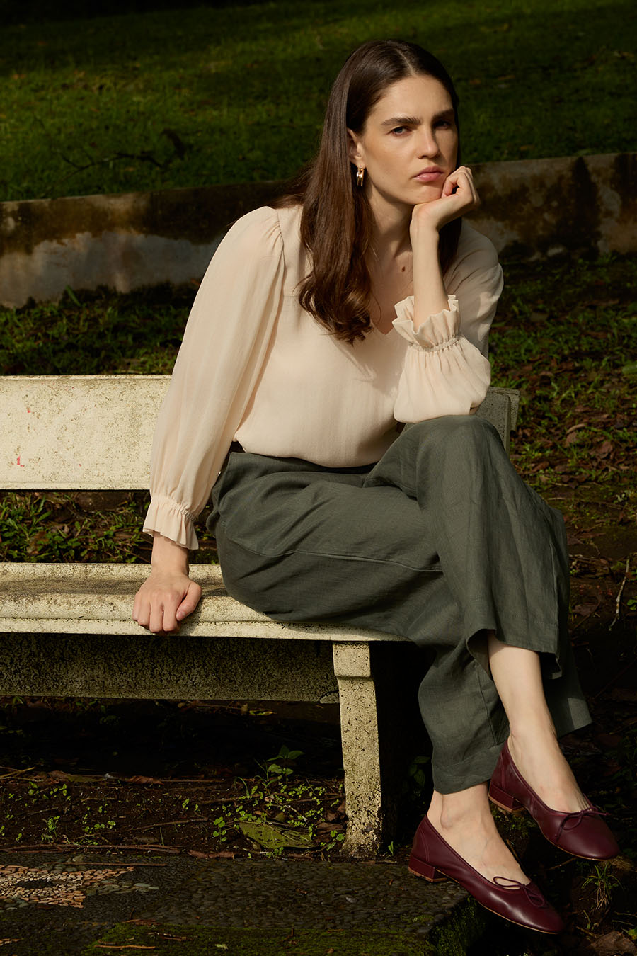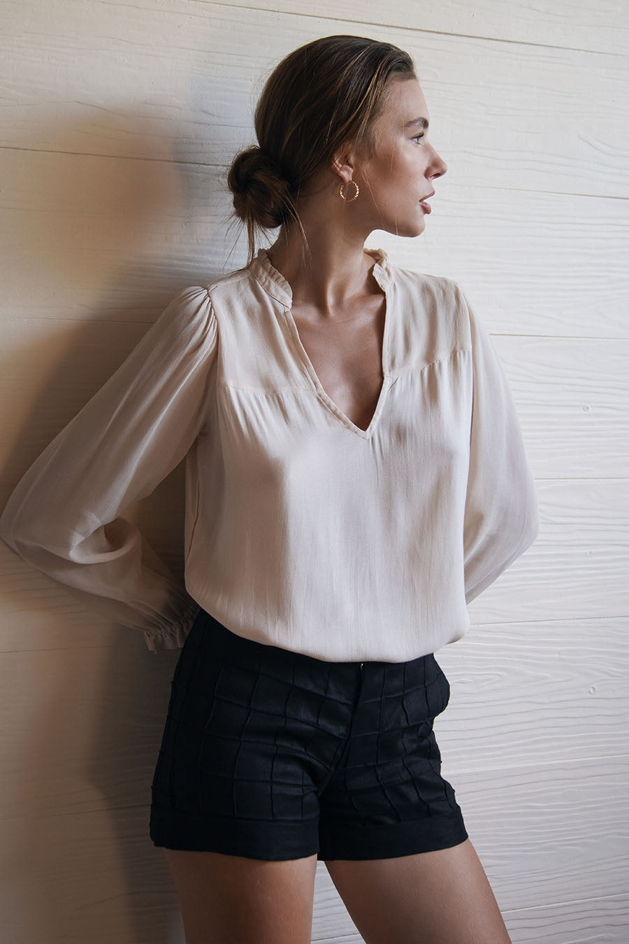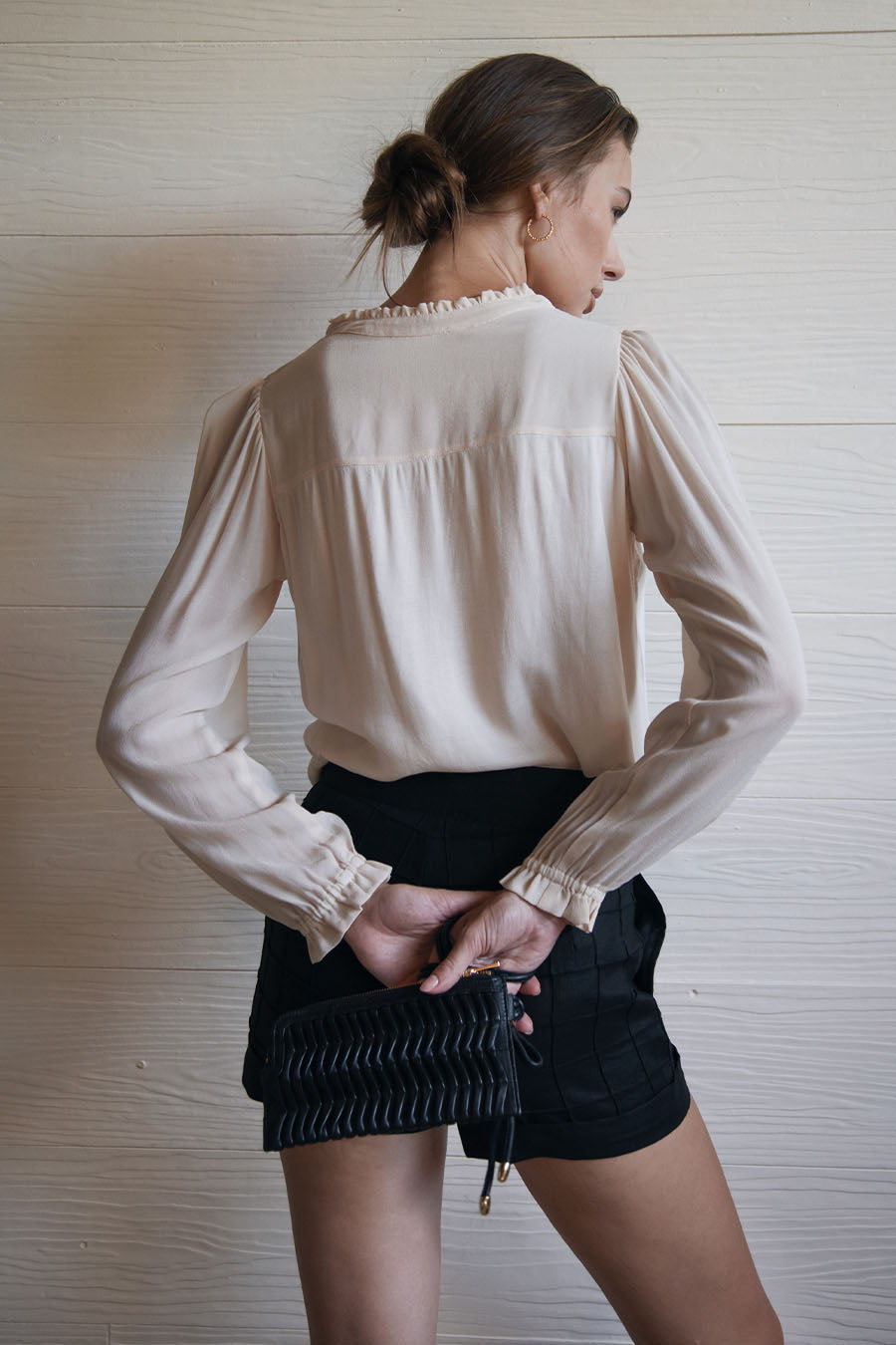 Elevate your look effortlessly with this versatile elegant rayon shirt. Features elasticated long sleeves and delicate ruffle details around the neckline, it offers a perfect balance of simplicity and sophistication.