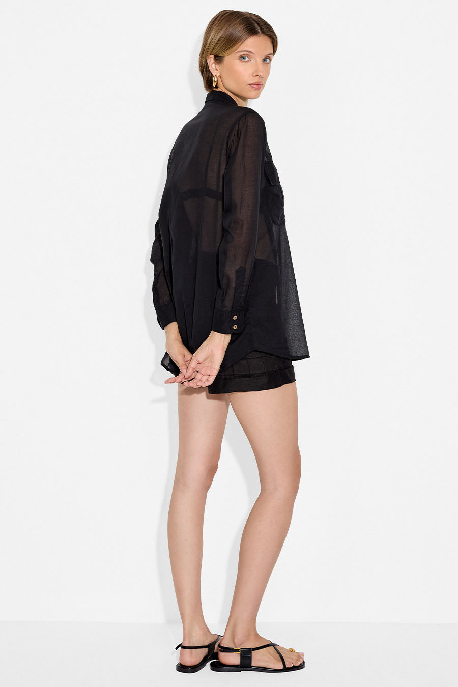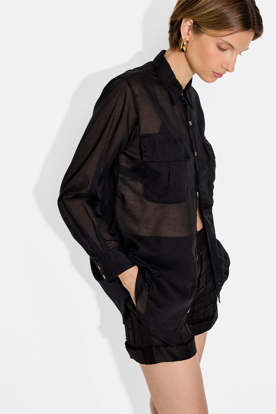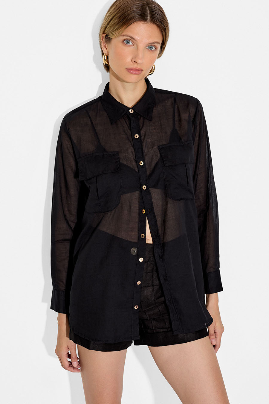 The Lilia Shirt is a versatile piece that can easily take you from day to night. Crafted from a slightly sheer cotton voile, this shirt exudes effortless elegance. Its shell buttons in the front add a refined touch to this classic piece, making it a wardrobe stable that you can dress up or down to suit your personal style. For a chic and edgy look pair the Lilia Shirt with the Oliver Mini Skirt, or style it with your favorite pair of jeans for a more casual look.