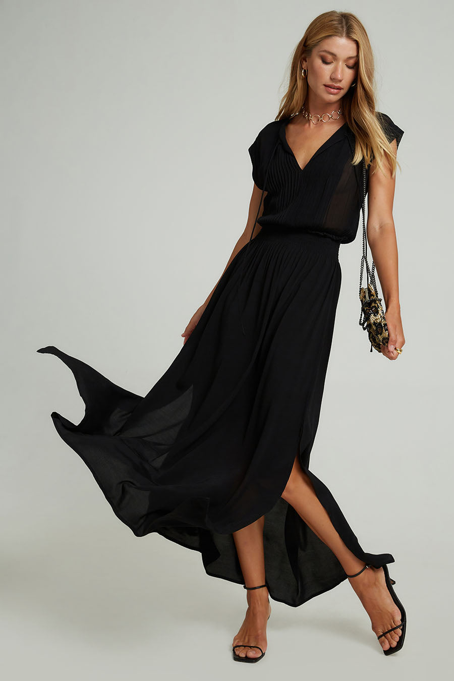 The Iris Maxi dress is the definition of classic and elegant. Featuring crafted pleat details, deep v neck and elastic shirred waistband to flatter your natural waist shape. This Dress is perfect for any special occasion.