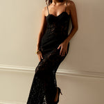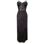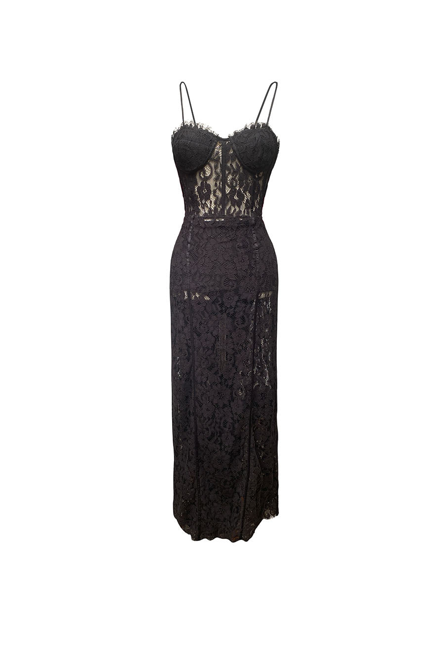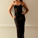 The Marissa Dress is a timeless black lace piece with a soft bustier cut (no boning) that enhances the silhouette. Designed with lined cups for coverage and a sheer lace body for an elegant, feminine look. It features a hidden zipper at the back for a clean finish and a matching spandex jersey underwear for comfort and confidence. The maxi length and delicate floral lace make it perfect for evening events or special occasions.